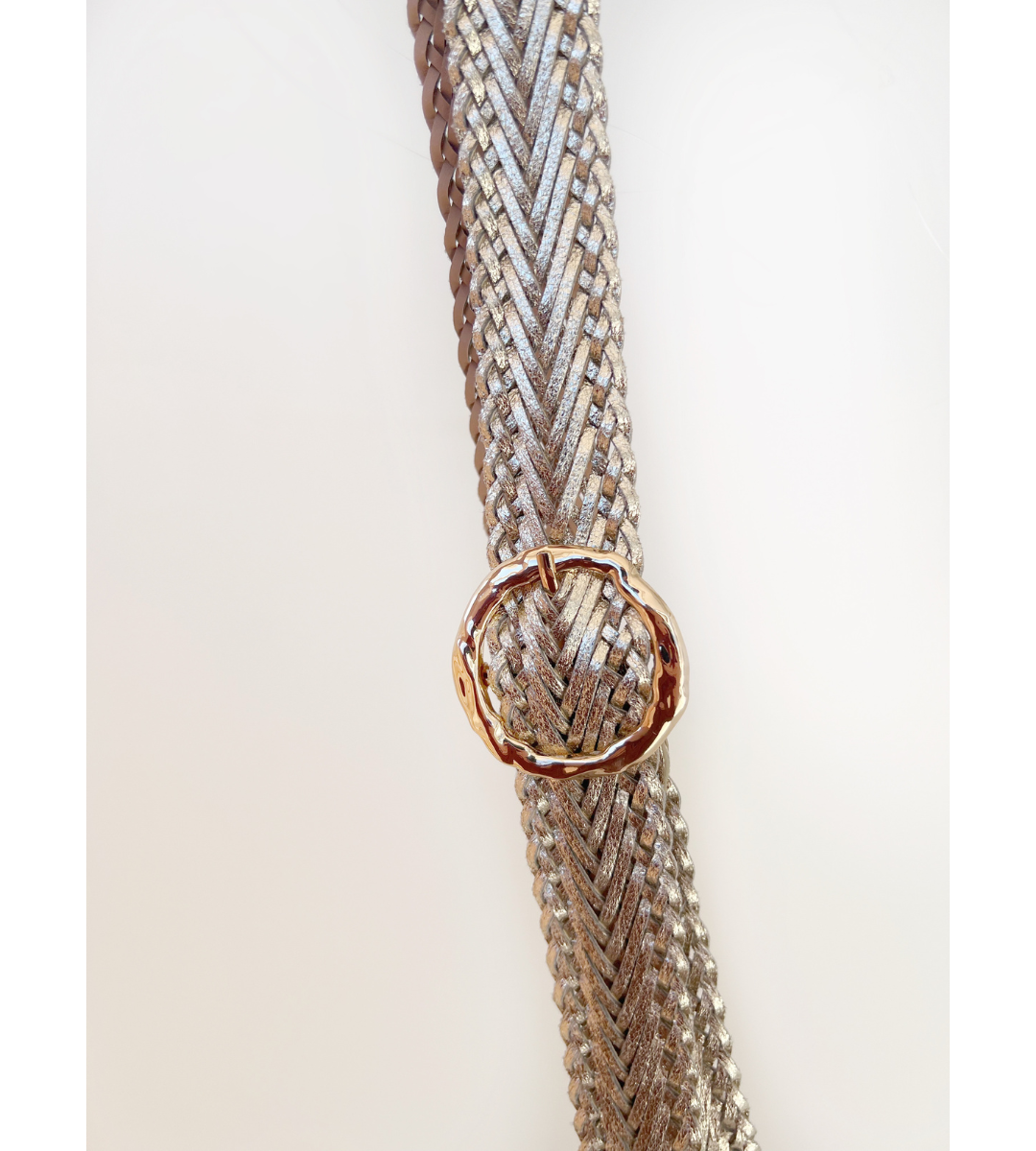 This chic gold braided belt designed to elevate any outfit. Its metallic woven detail adds a touch of polish and texture, while the adjustable fit ensures versatile styling—perfect for cinching the waist of dresses, blazers, or high-rise denim.