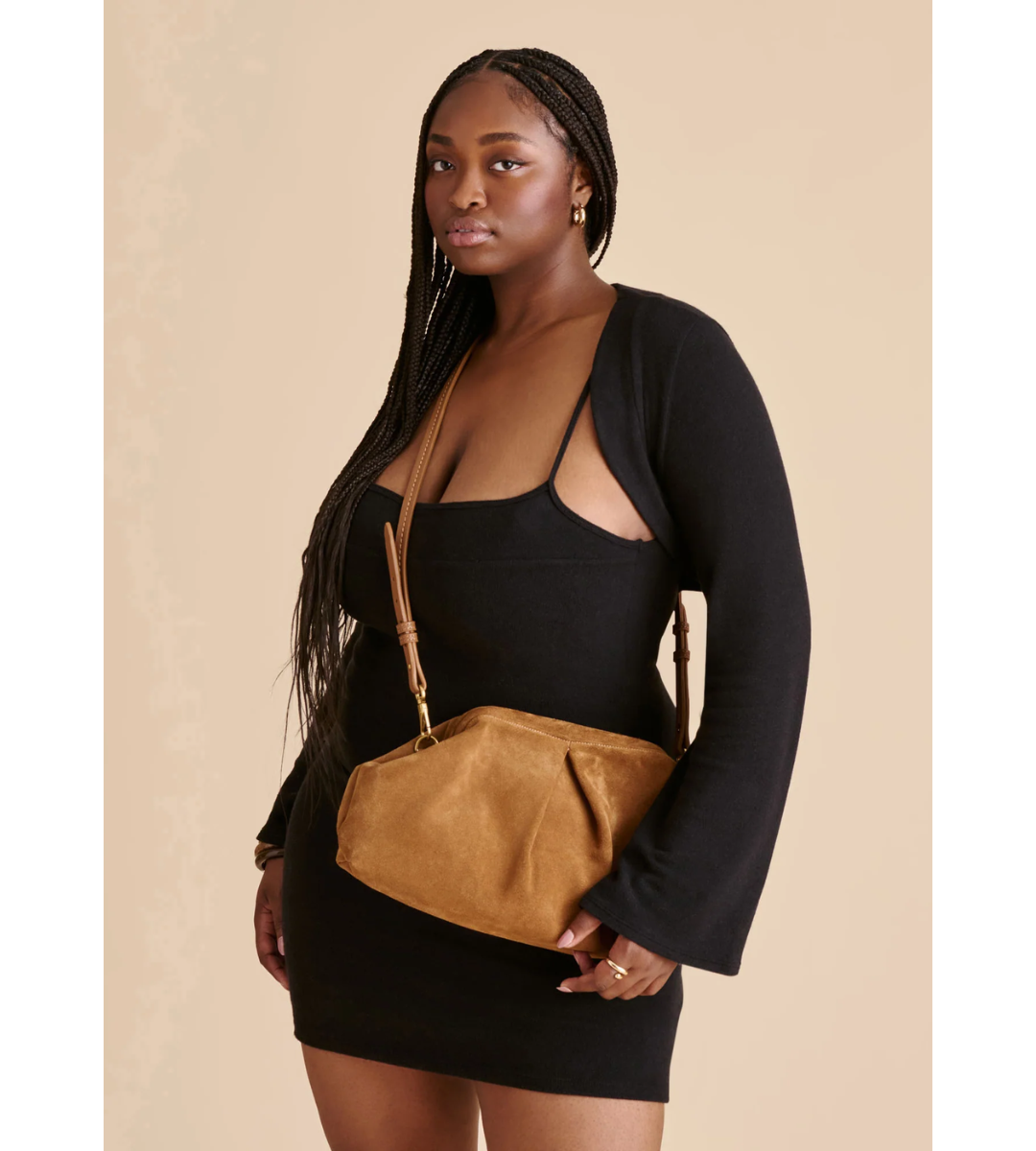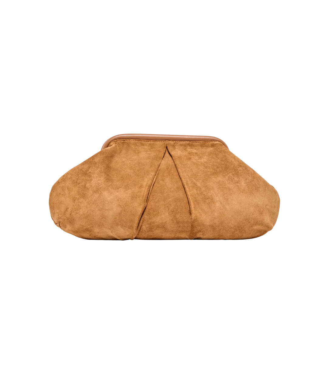 The Sahara Handbag is the ultimate fall clutch for every event on your calendar. Luxe suede in cognac or espresso, a slightly pleated design, and a frame closure complete this spacious bag. Utilize the detachable crossbody strap for a hands-free option and head out to the party.