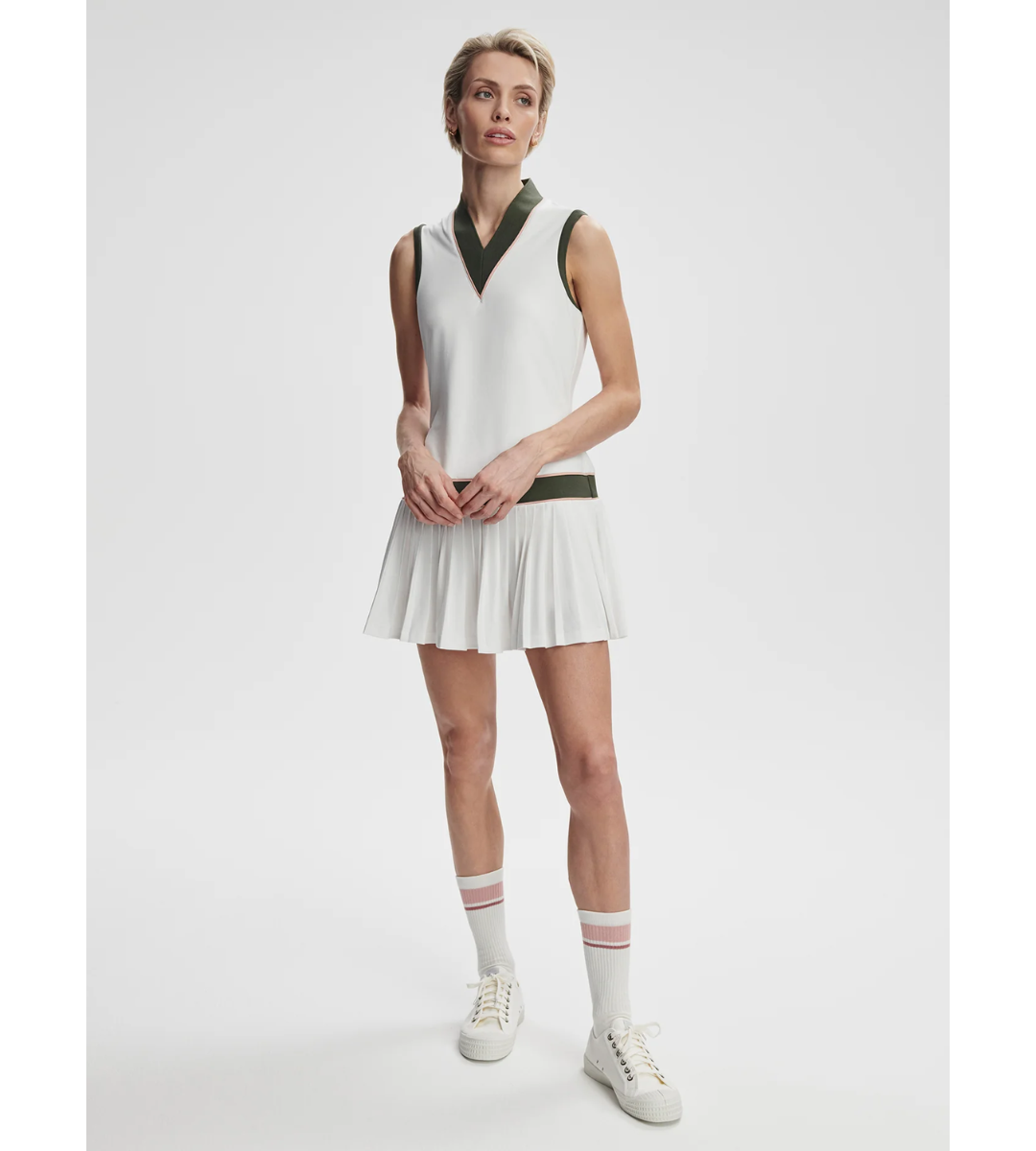 For 2-in-1 perfection, look no further than the Jouri court dress, which is made from a soft and lightweight recycled micro jersey fabric. The rib trims and contrast piping add structure to this elegant V-neck dress with a drop waist. A removable short is attached inside with snap loops for double functionality.