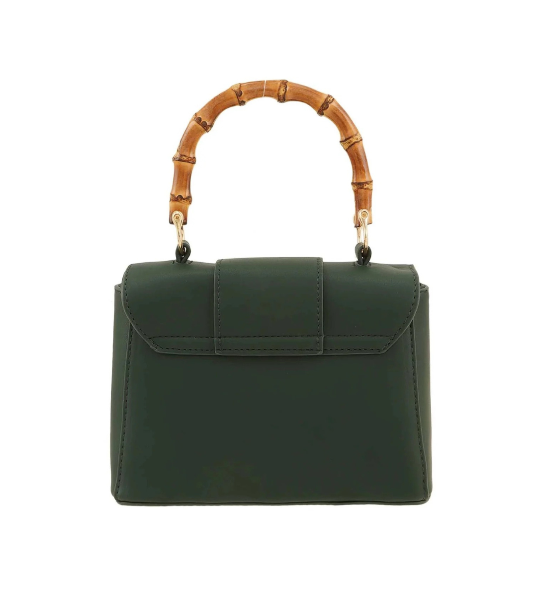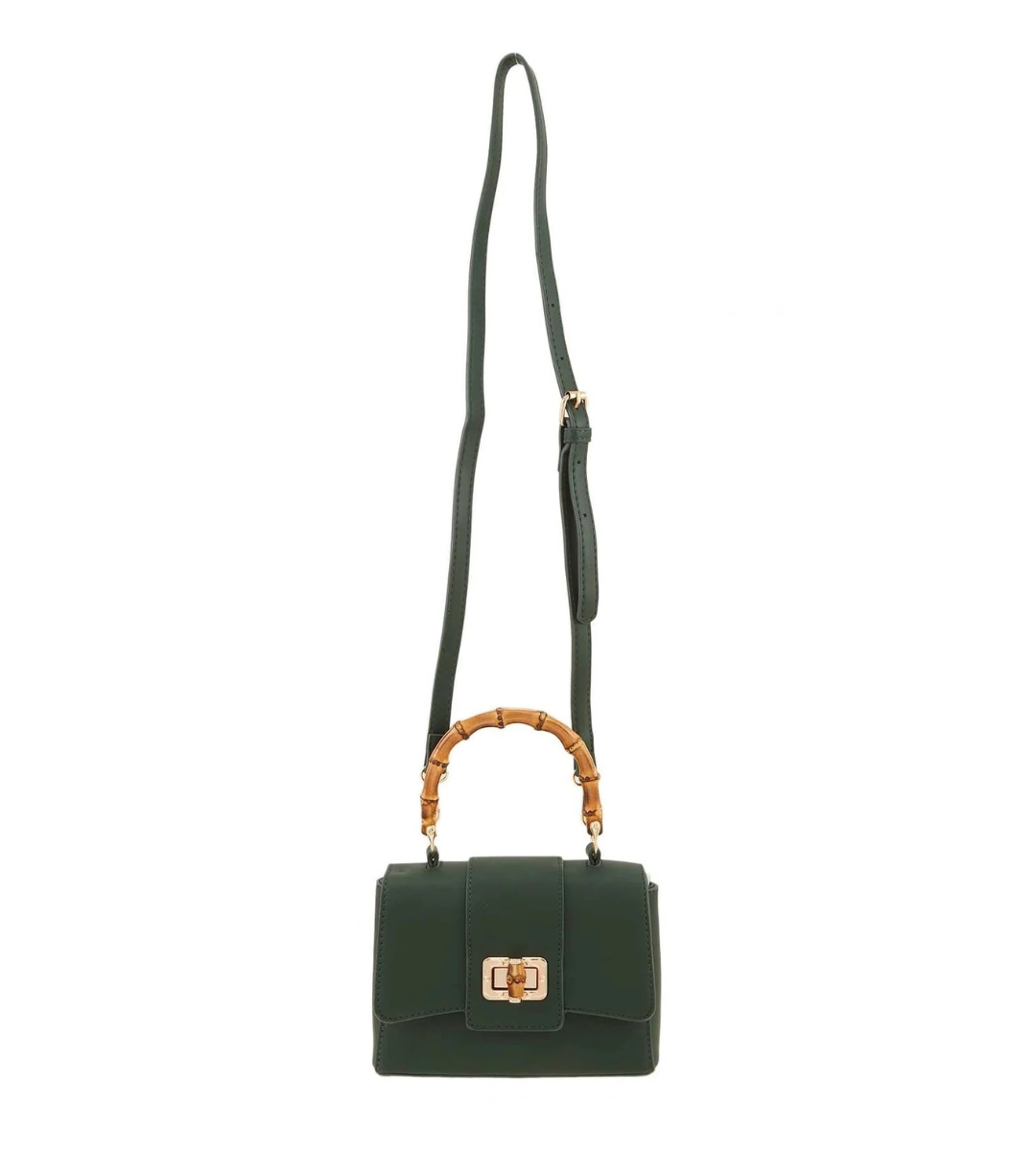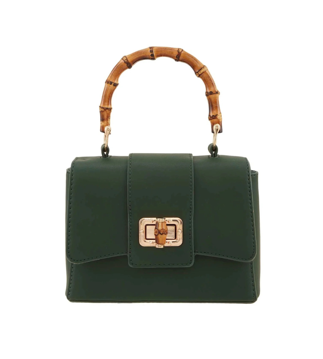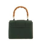 Sophisticated and timeless, this green handbag is elevated with a natural bamboo handle for a chic, modern-meets-classic touch. The structured silhouette keeps it polished, while the gold hardware and bamboo turn-lock closure add just the right amount of detail. Perfect for both day and evening wear, this versatile piece brings elegance to any outfit—whether carried by hand or styled as your go-to statement accessory.
