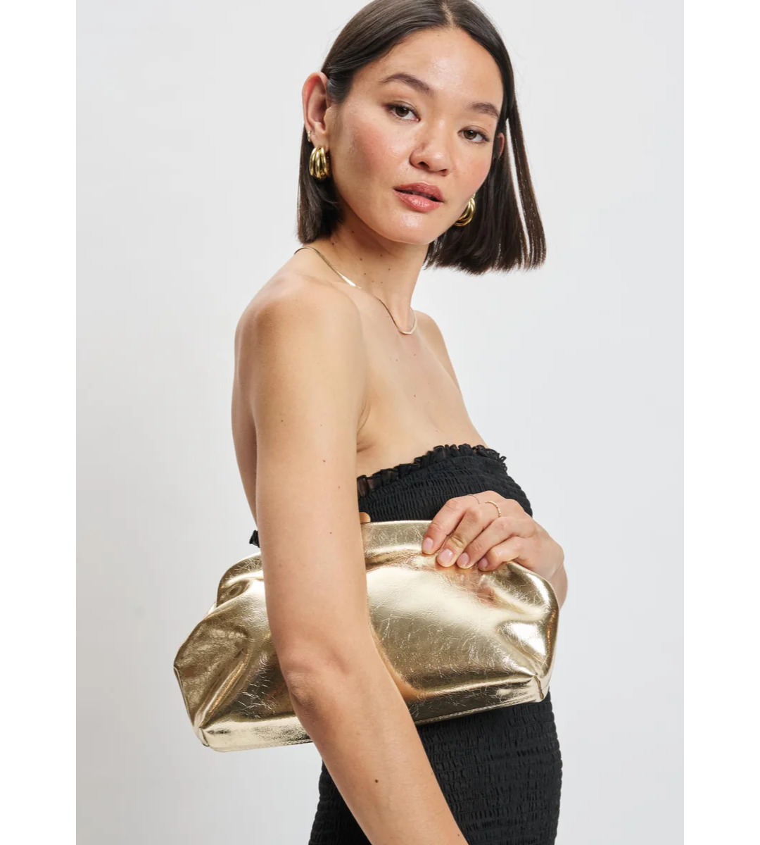 Make a statement without saying a word with the Camille Clutch. This chic handbag features a timeless silhouette enhanced by a stunning metallic finish. Perfectly sized to hold your essentials, it effortlessly transitions from day to night.