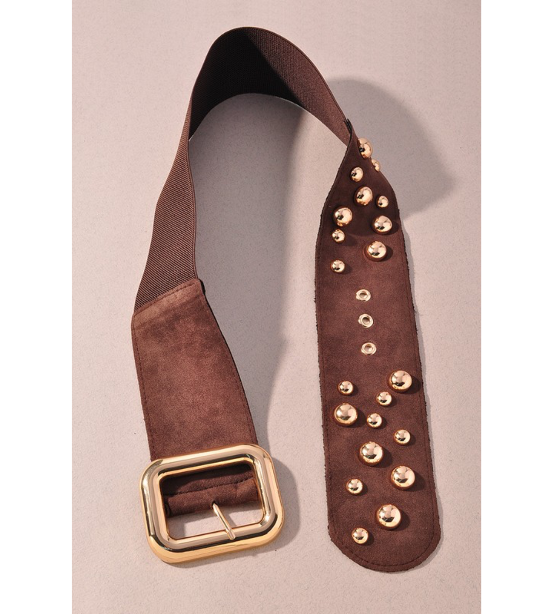 Add bold style and structure to any outfit with this wide grommet belt. Crafted from rich dark brown suede, it features dual rows of oversized gold grommets that add a striking edge. The wide design makes it perfect for cinching at the waist over dresses, blazers, or high-rise jeans. Finished with a coordinating gold-tone buckle, this belt blends utility with standout fashion for a versatile, statement-making accessory.