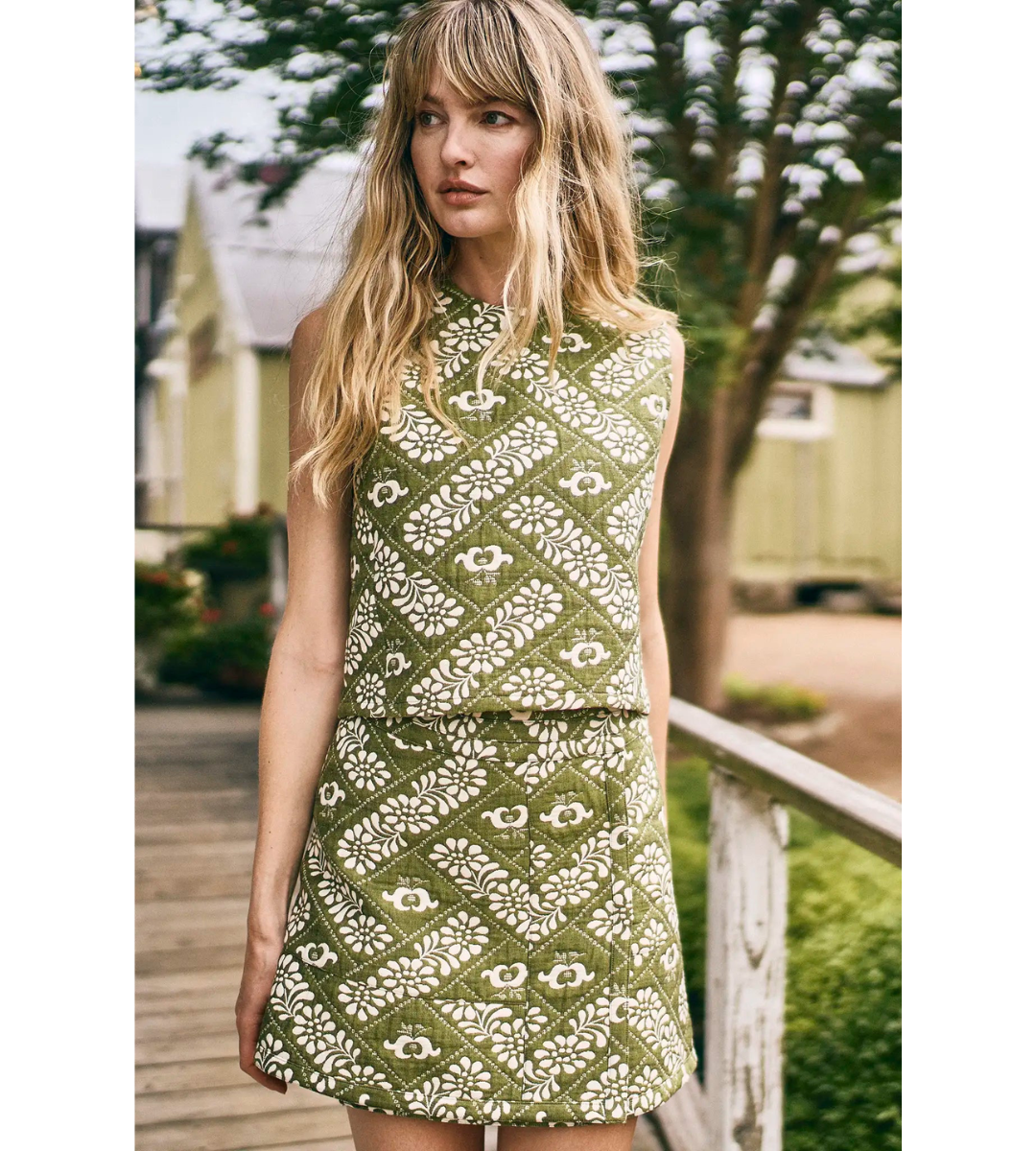 Flirty and fresh, the Powell Skirt is a high-waisted mini crafted in a bold olive and cream block print. Its clean lines and structured silhouette make it a standout for sunny days. Pair it with the matching Manning Top for a coordinated look that’s both striking and effortless.