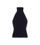 The form-fitting Samson Top is a ribbed knit open back halter with a luxurious, oversized turtleneck. The vertical rib knit stitch creates a figure-flattering silhouette.