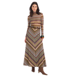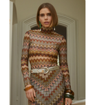 The Conner Top is cut in chevron knit fabric featuring a high neckline and slim fit through the body and sleeves. Designed with a center back zipper and is unlined. Pair the Conner Top back to the matching Olive Skirt for a 70's-inspired set.