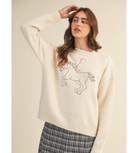 The Jeanne Sweater is a charming twist on a classic pullover, crafted in a soft ivory knit with detailed horse embroidery for a touch of whimsy. Featuring a ribbed round neckline, drop shoulder long sleeves, and ribbed cuffs and hem, this sweater blends comfort with standout style. Perfect for pairing with denim or layering over a collared shirt, the Jeanne adds a playful yet polished feel to your everyday wardrobe.