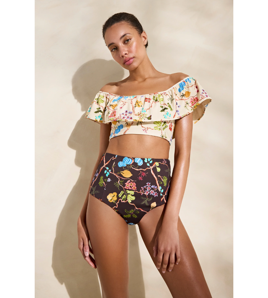 The ruffled Emily top can be worn off the shoulder (bye, bye tan lines) or as true straps for more security. Its versatility means it’s the bikini top you'll reach for over and over again, whether you're sitting poolside with your kids or lounging by the water in a far flung tropical paradise. Emily is pictured here in Orchard. To complete the look, pair Emily with the high-waisted Micah Bottom in Grove.