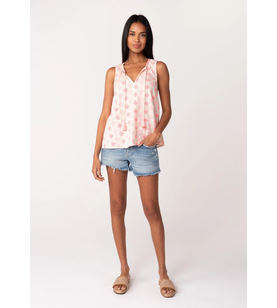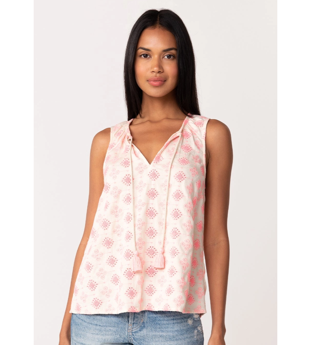 A beautiful bohemian tank top designed with pink embroidered details on a textured cotton fabric