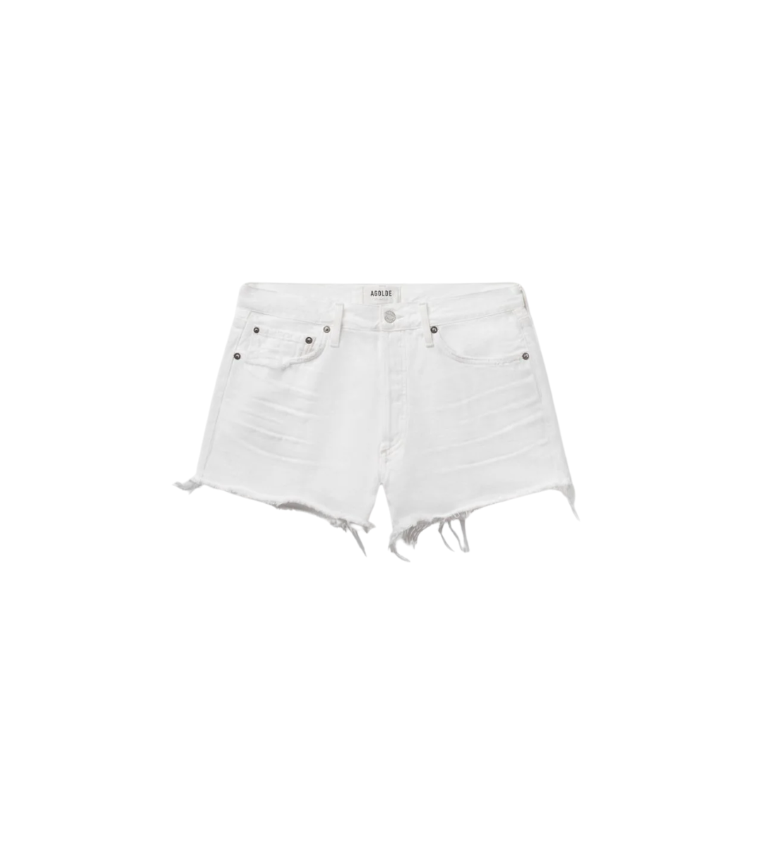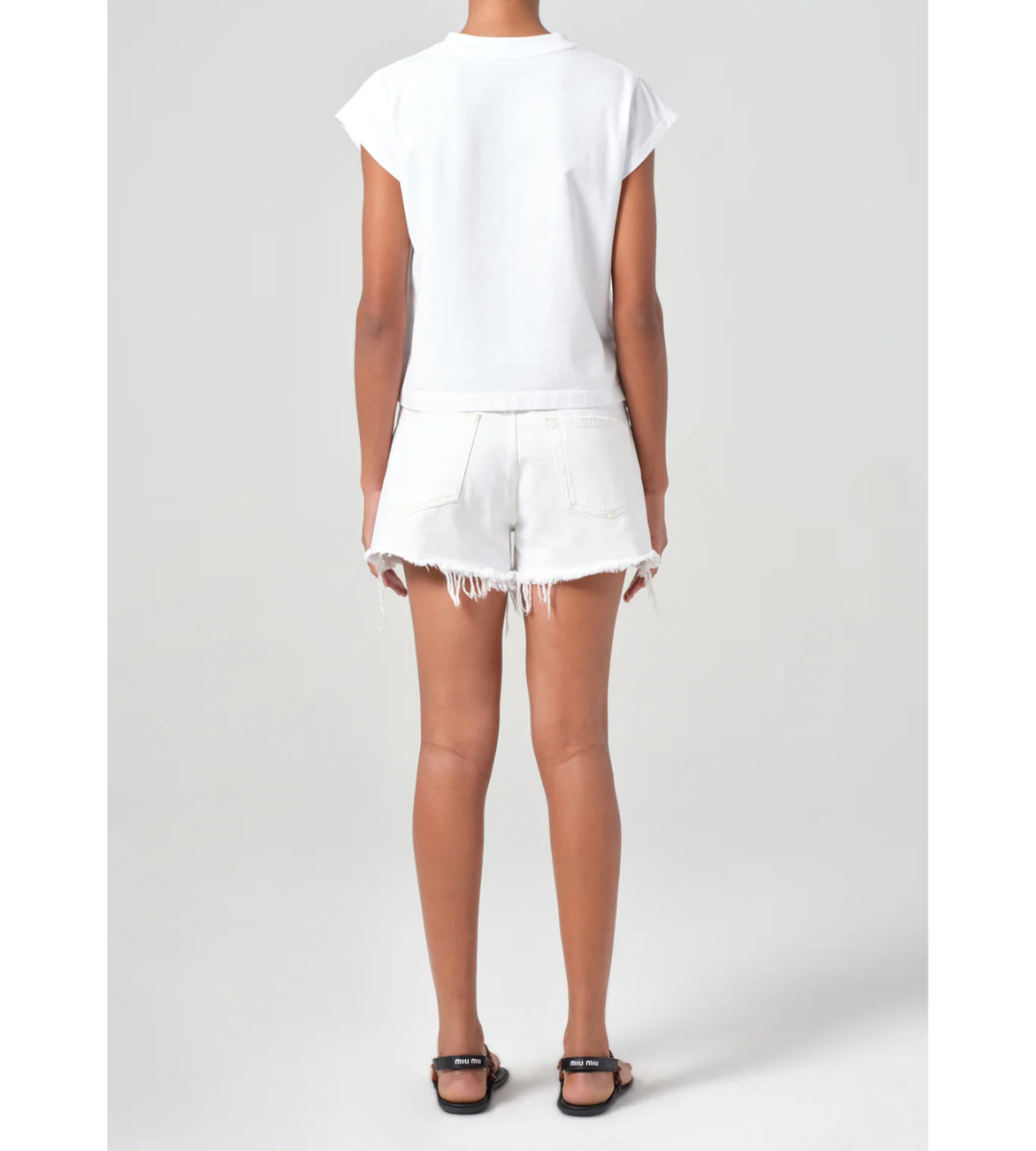 The Parker Short in clean white denim offers a high-rise fit with a relaxed silhouette through the hips. Made from regenerative cotton, these non-stretch shorts deliver a crisp, fresh look that's both stylish and versatile. Perfect for pairing with casual tees or lightweight blouses for an effortless, laid-back vibe. By Agolde.