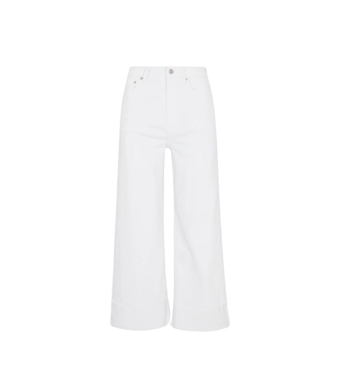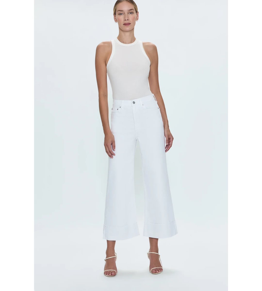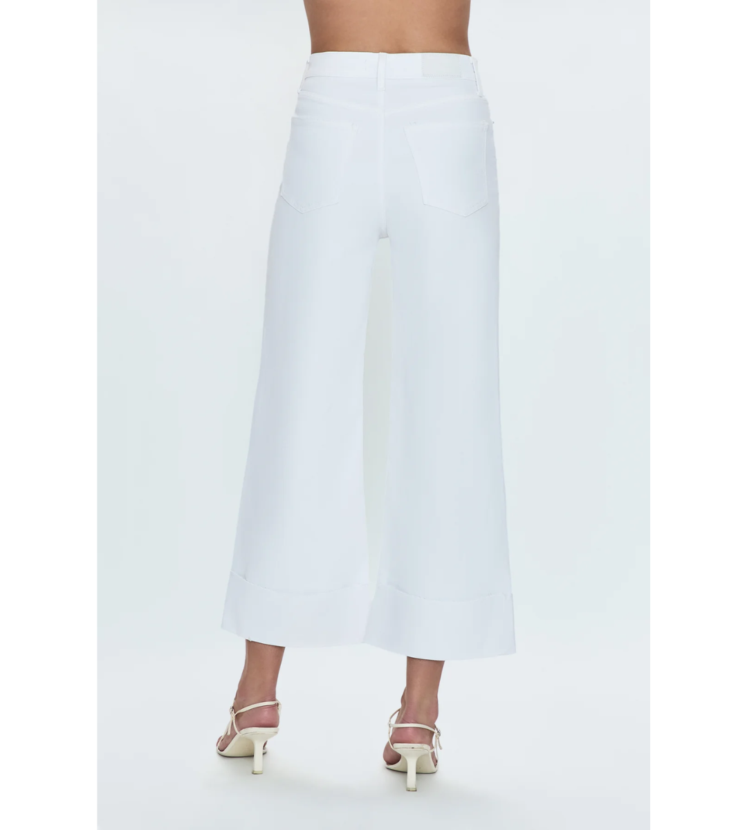 A relaxed, ultra wide leg silhouette featuring a raw finished hem and wide, stitched cuffs. Crafted from signature comfort stretch denim to provide a structured shape with just the right give. Vivid White is a pure white denim wash with metal hardware finishings. By Pistola.