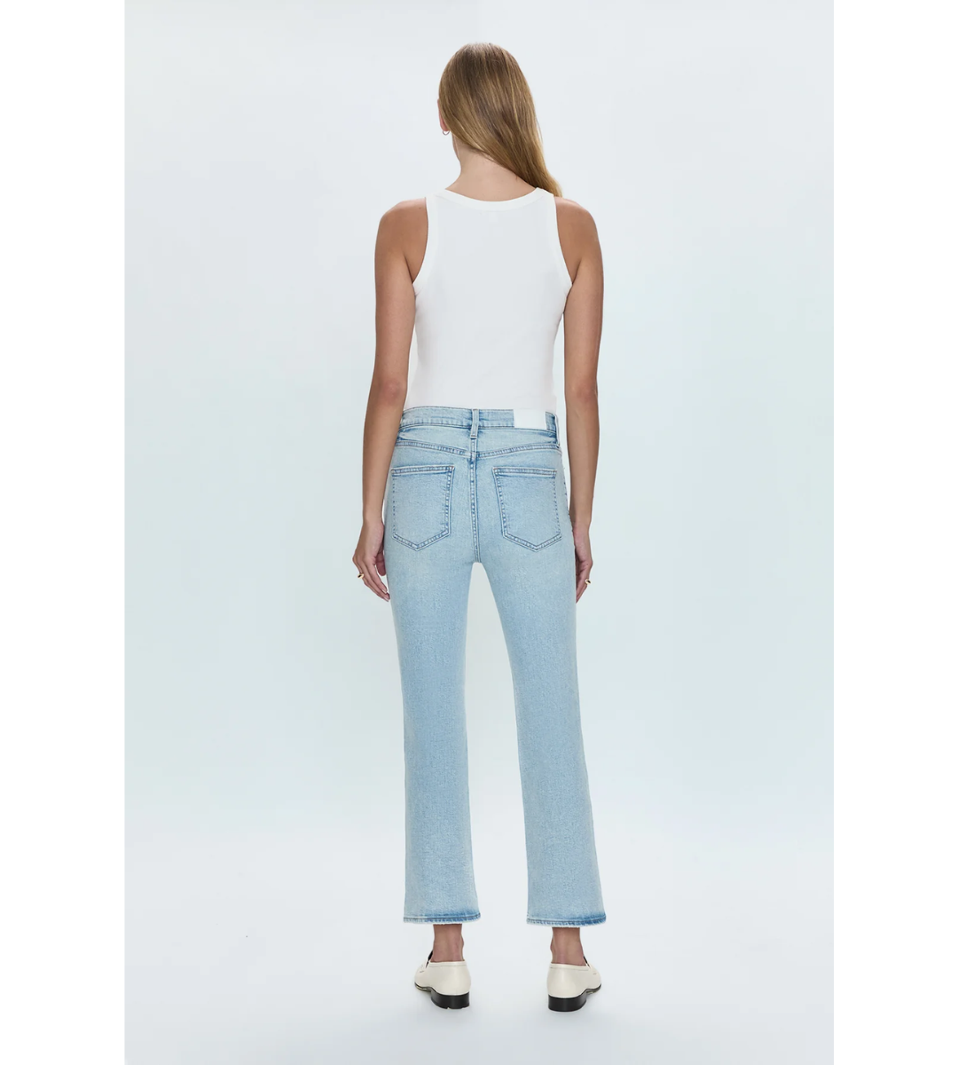 High rise waist with a boot cut leg silhouette and cropped ankle hem. Crafted from our best selling comfort-stretch denim. Offered in a light blue wash with whiskering and fading. By Pistola.