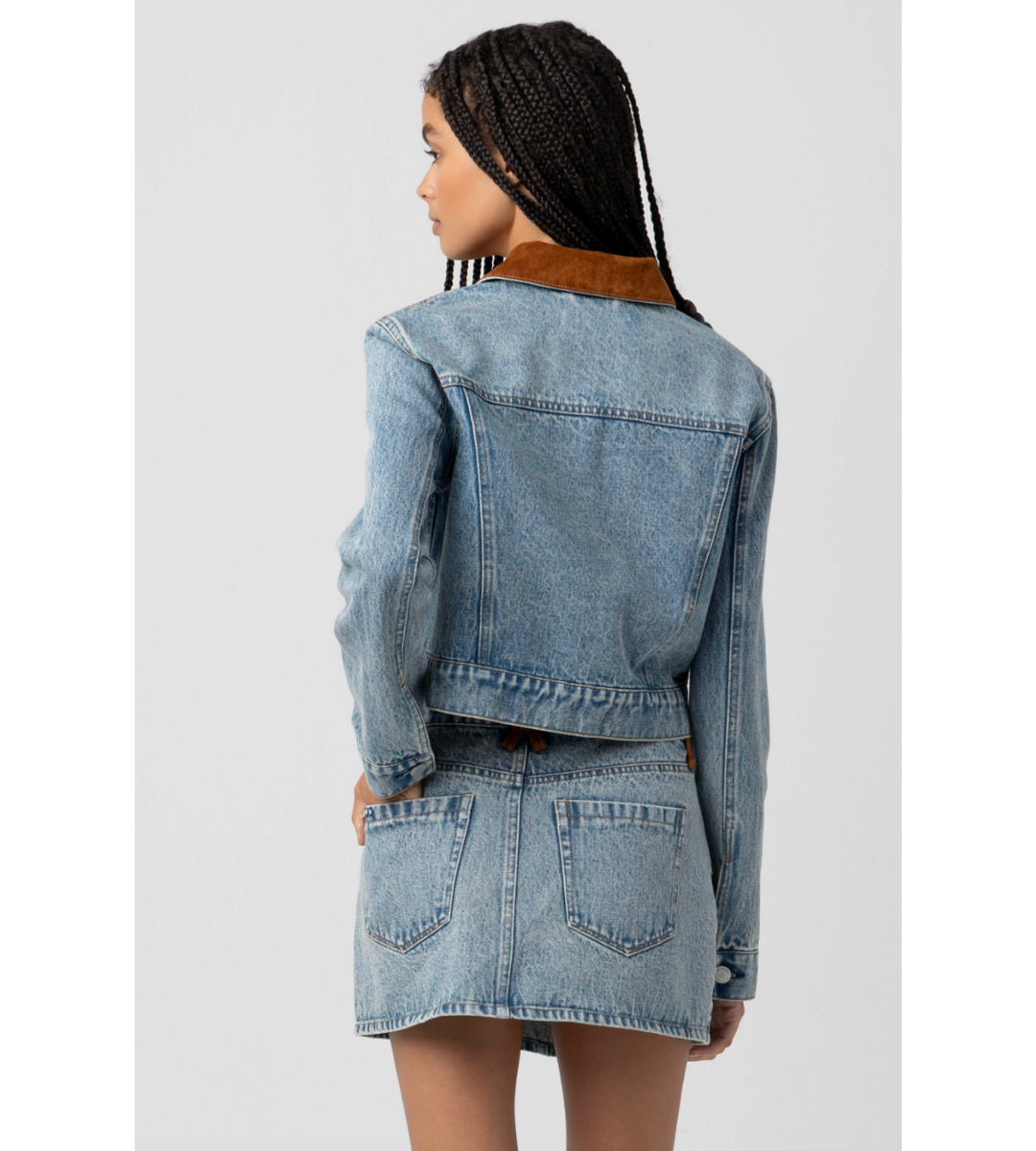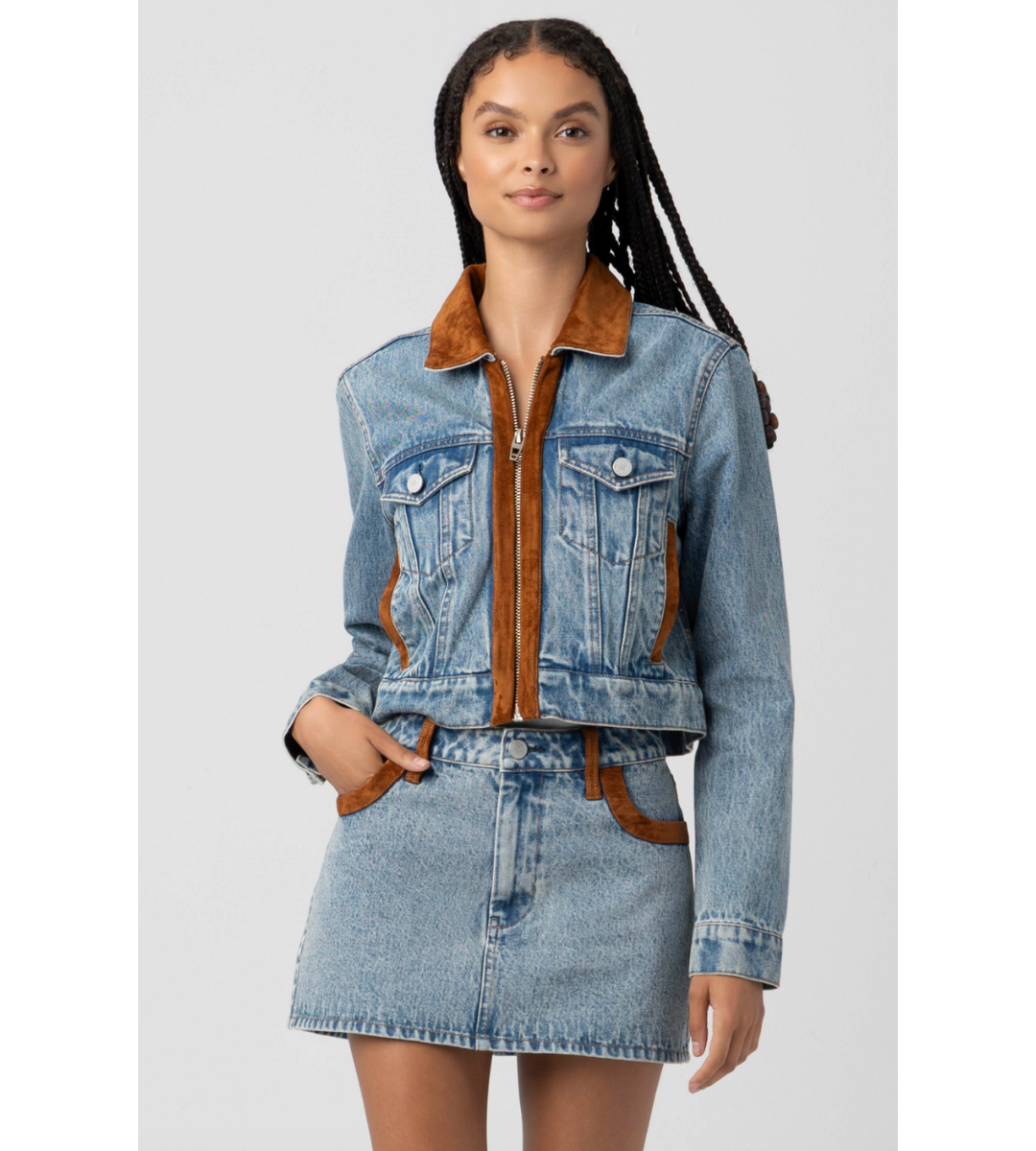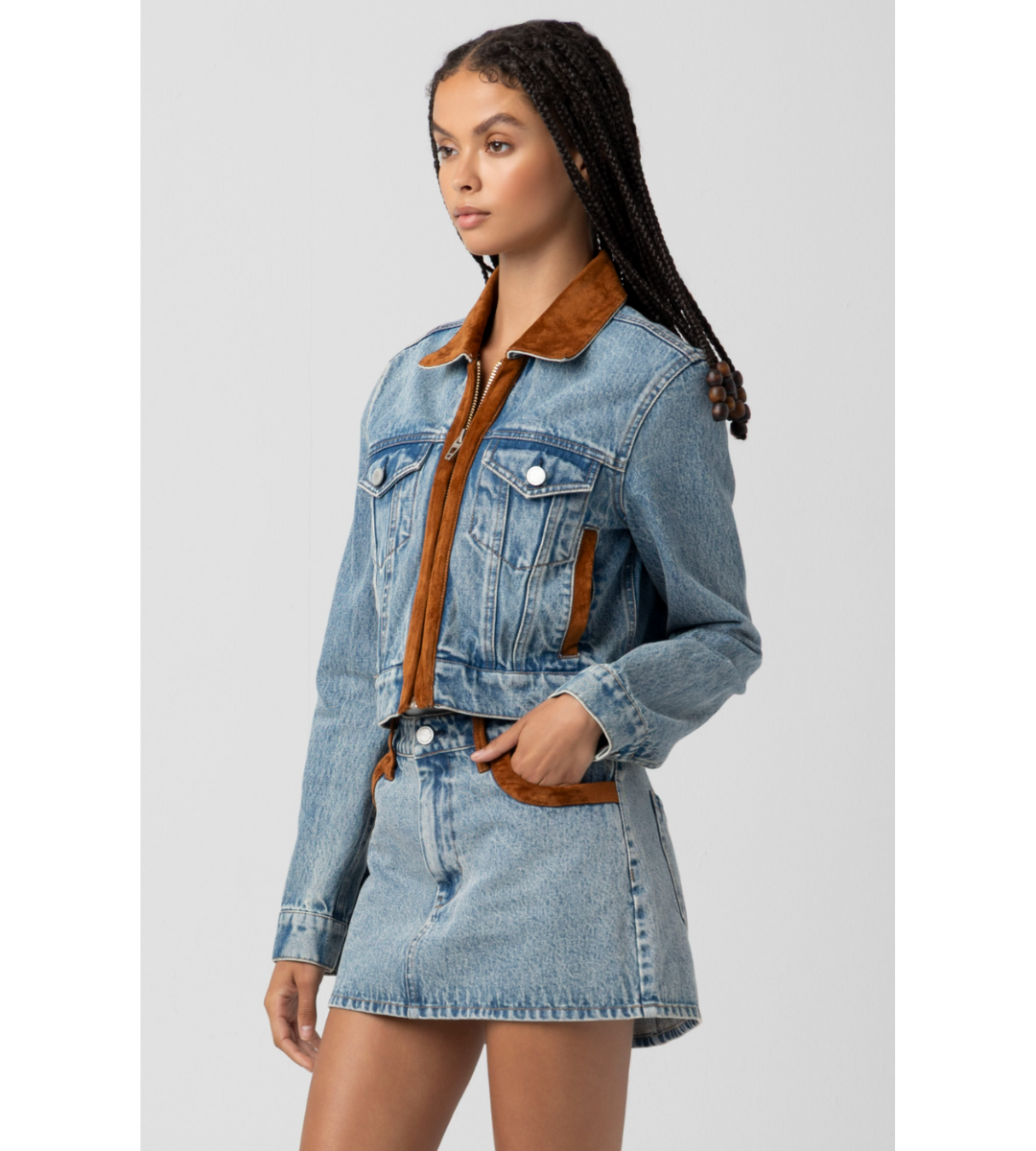 The Rodeo Drive Jacket is a fresh twist on the classic denim jacket. This cropped-fit style features rich brown suede accents along the zipper closure and collar, adding warmth and texture to the cool denim base. Perfect for layering, it brings a modern edge and effortless style to any outfit. Own your look with this standout piece.