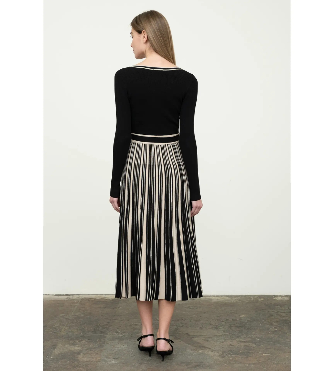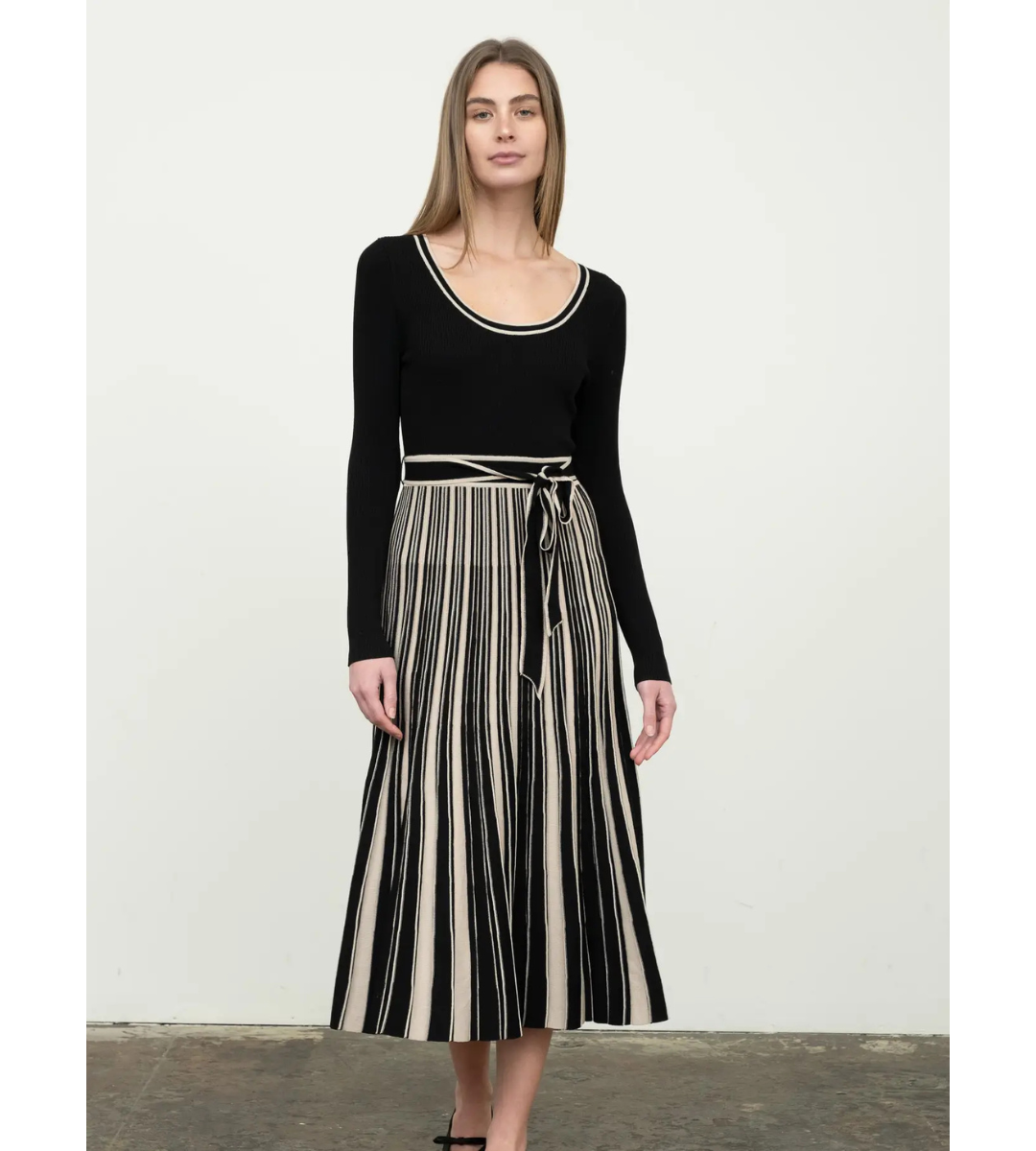 The Striped Knit Sweater Midi Dress is a cozy-chic staple with effortless polish. Featuring long sleeves and a flattering waist tie, it accentuates the figure while offering comfort and versatility. Its classic stripe pattern adds a timeless touch, making it perfect for everything from casual days to elevated gatherings with a simple change of accessories.