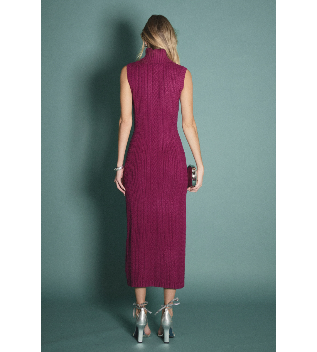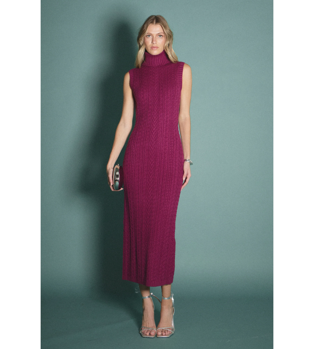 Crafted in soft, textured cable knit fabric, this sleeveless silhouette features a chic mock neckline and a flattering midi length, striking the perfect balance between comfort and elegance