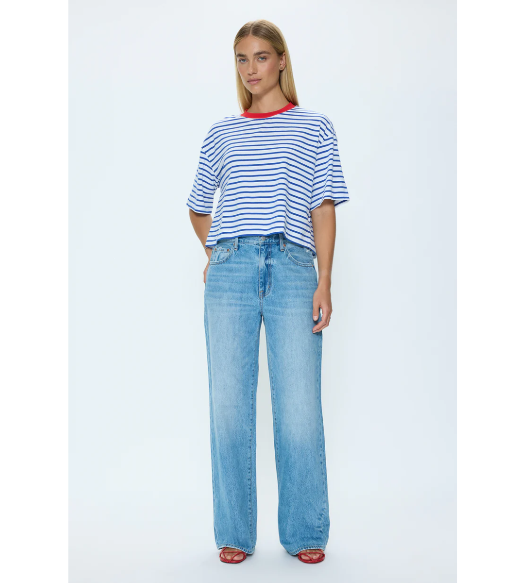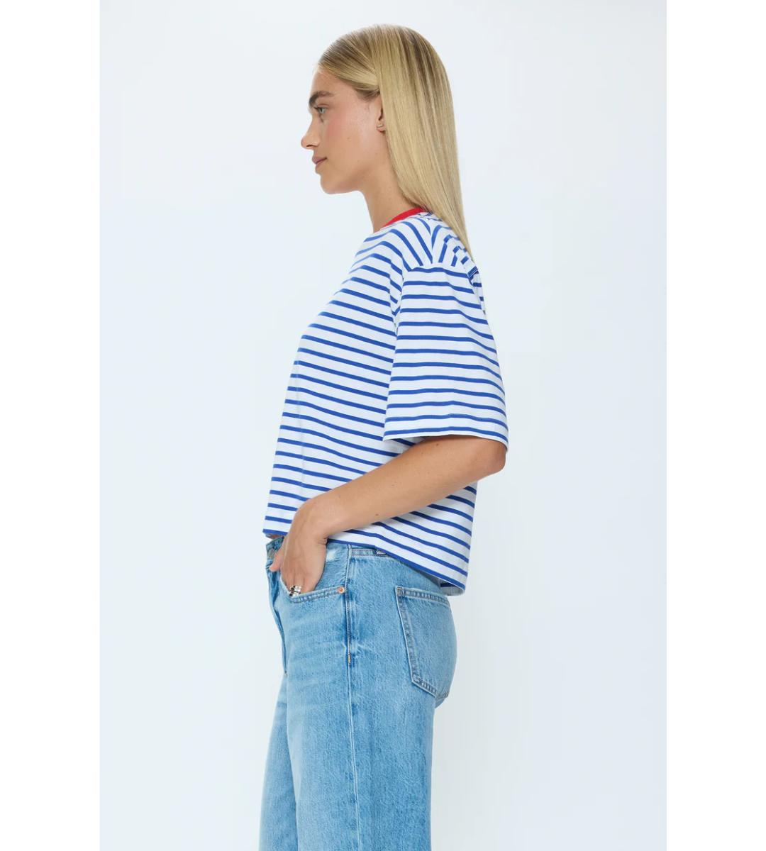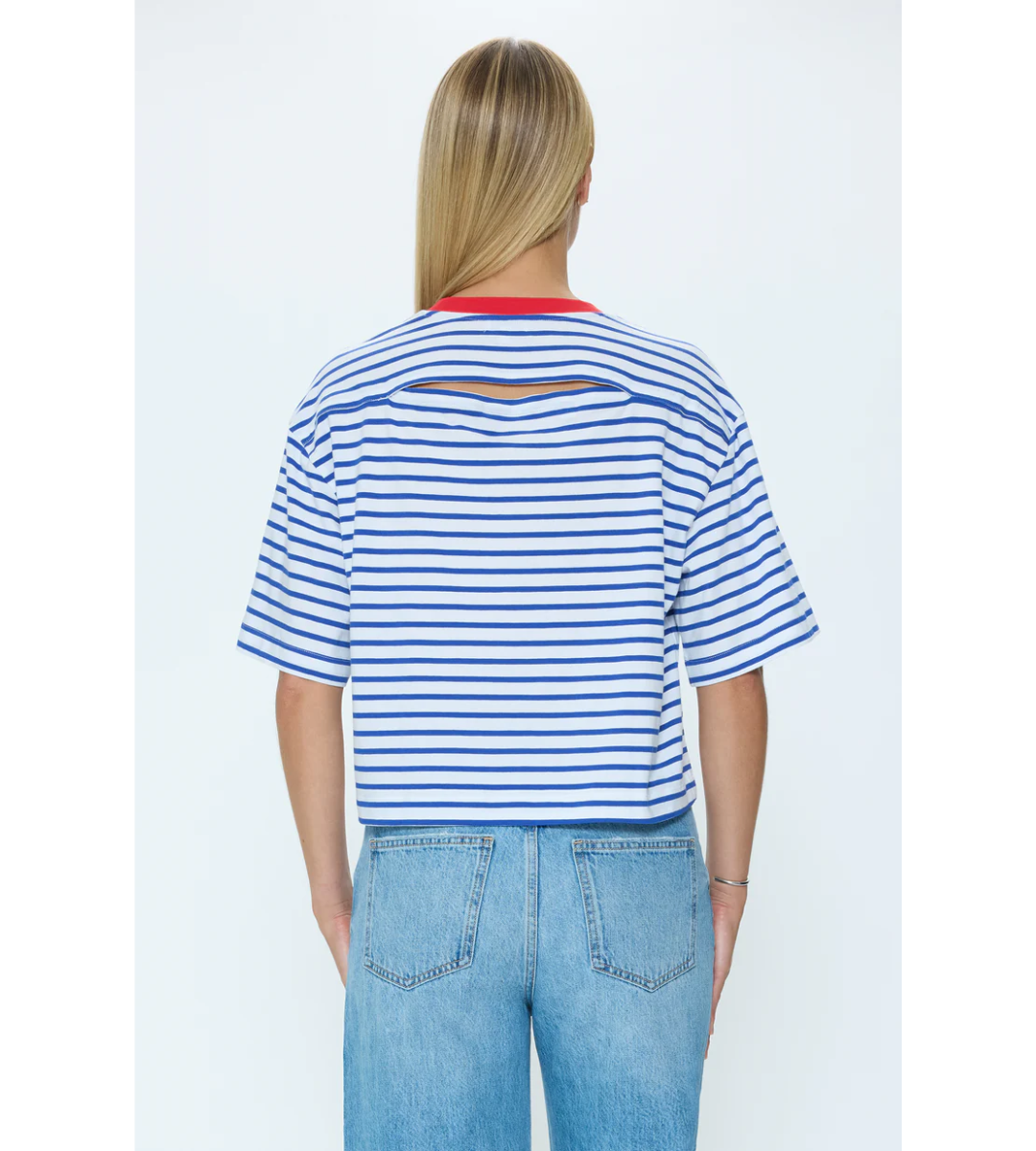 Mae updates the essential tee with an oversized fit, crisp short sleeves, and clean, cropped length. The open-back cutout softens the silhouette and adds a subtle, feminine reveal. In a blue and white stripe with a contrasting red banded collar, this Springtime essential brings versatility to a classic, borrowed-from-the-boys shape.