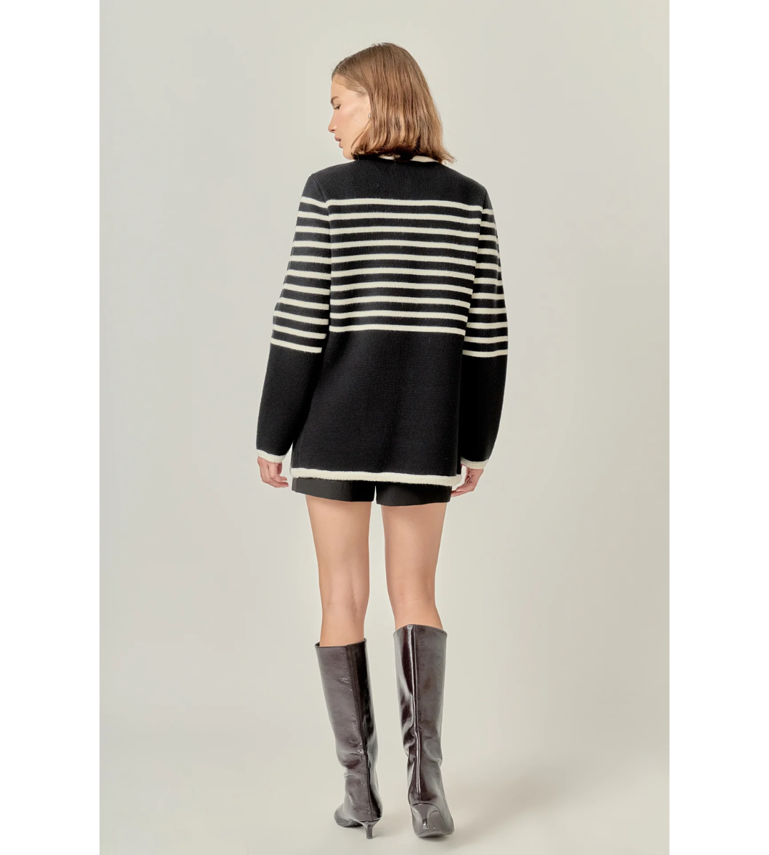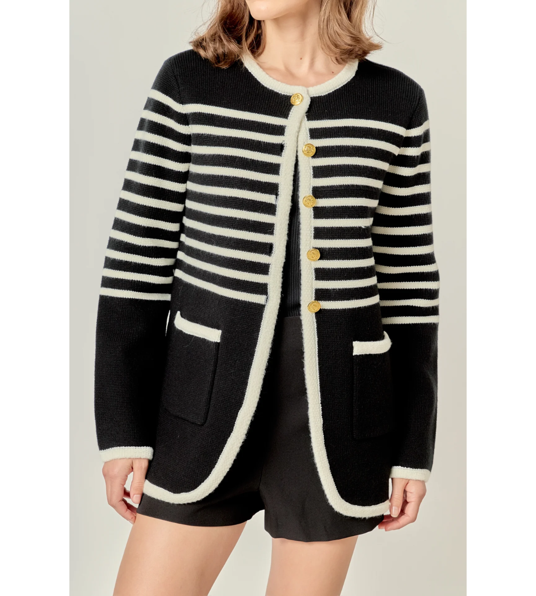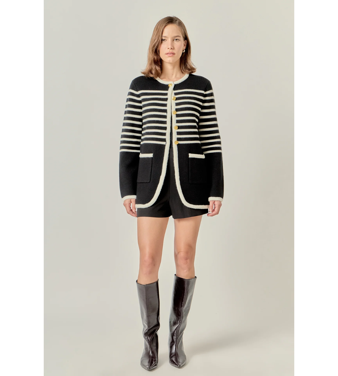 Classic meets modern in the Hayes Striped Knit Sweater Cardigan — a timeless piece with standout details. Crafted from thick, cozy knit fabric, this cardigan offers warmth without compromising on style. The bold horizontal stripes and contrast trim create a polished, structured look, while the gold embossed buttons down the front add a luxe finishing touch. Featuring two front patch pockets and a flattering longline silhouette, it’s perfect for layering over your favorite basics. From casual days to elevated evenings, this cardigan brings sophistication to every outfit.