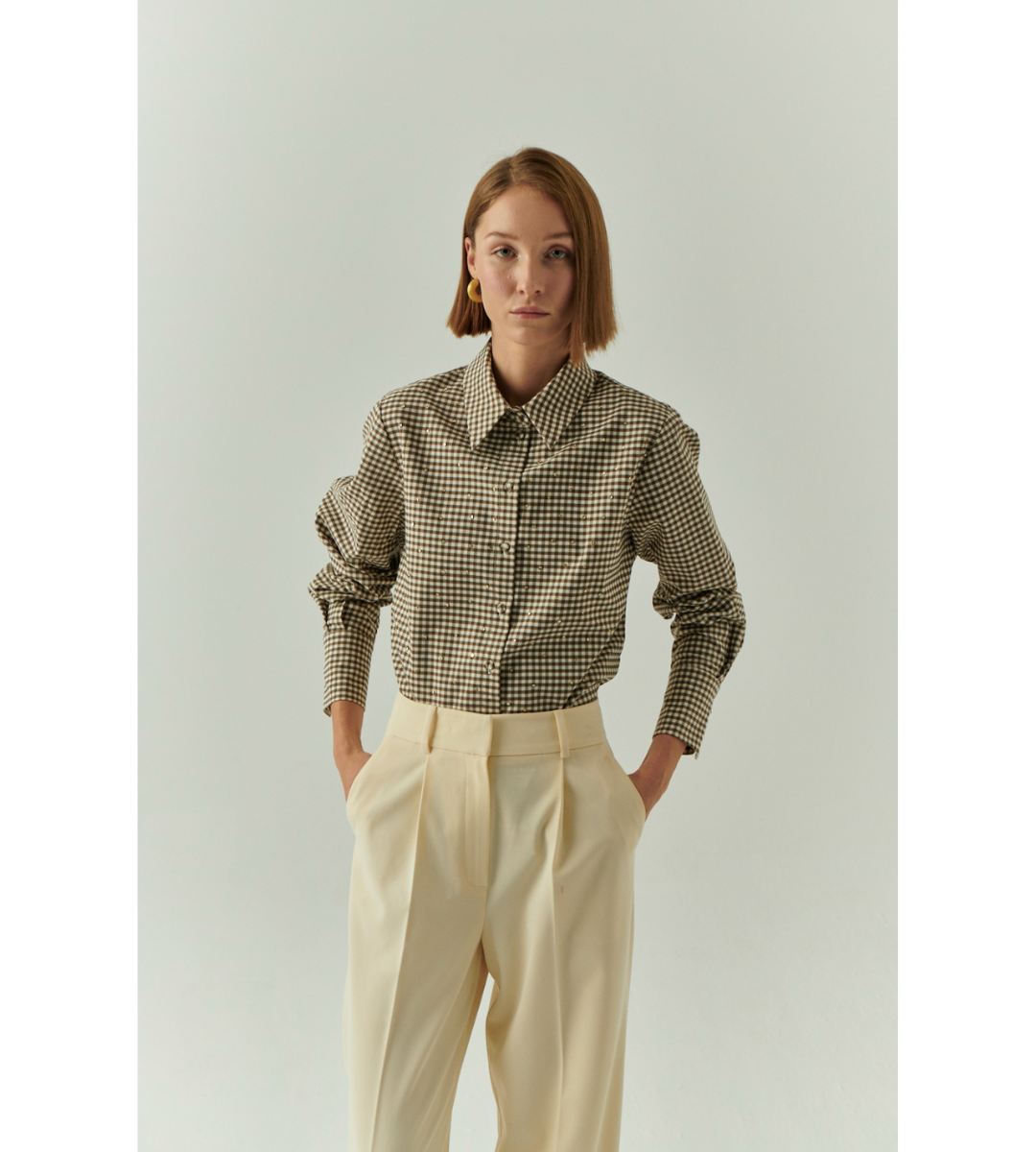 Elevate your everyday with the Jamie Shirt—a classic collared button-down reimagined with a touch of charm. Featuring a soft cream mink plaid and subtle embellishments throughout, this long sleeve top adds just the right amount of sparkle to a timeless silhouette. The relaxed fit makes it perfect for layering or wearing solo for a polished-yet-playful look.