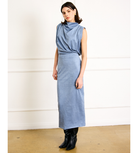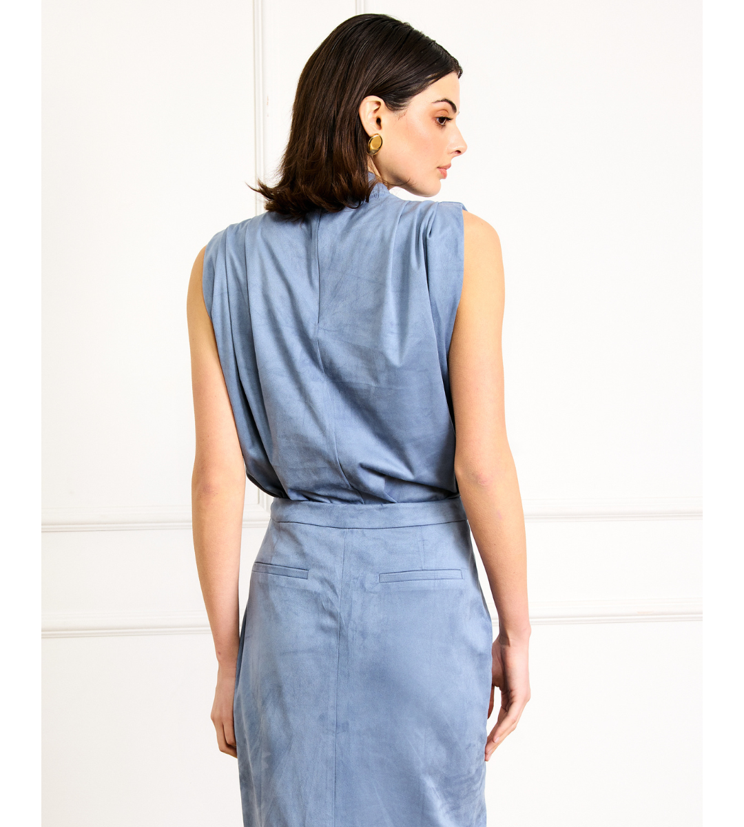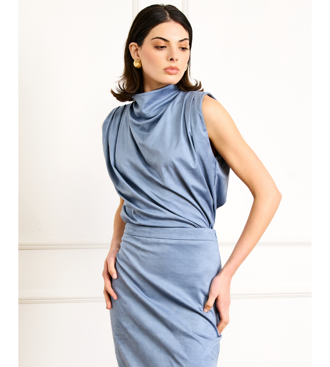 The Alix Top features a structured, boxy fit with a polished high neckline, crafted in soft steel blue suede to match the Alix Skirt. Effortlessly chic and modern, it’s a statement piece that balances clean lines with luxurious texture—perfect for sophisticated fall styling.