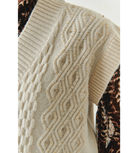 A chunky cable knit sleeveless sweater with a bold V-neck and open sides. Adoria is designed for layered styling with shirting or on its own.