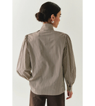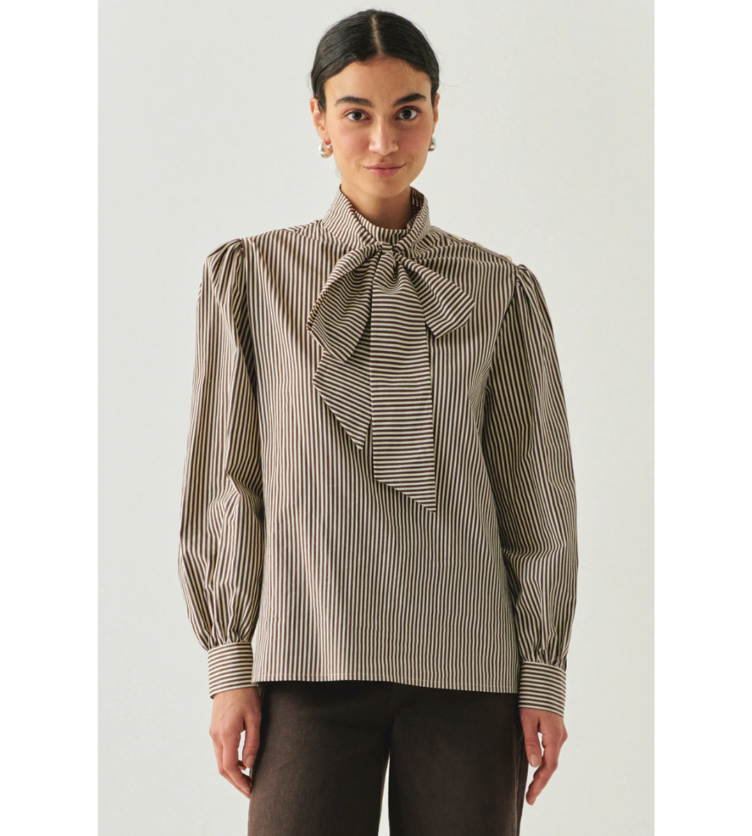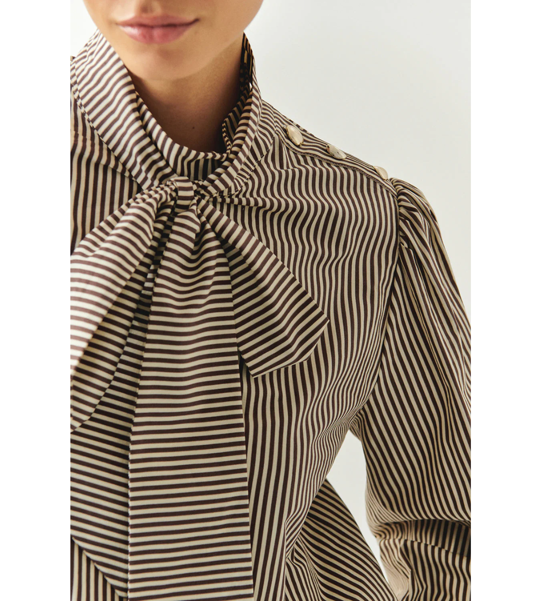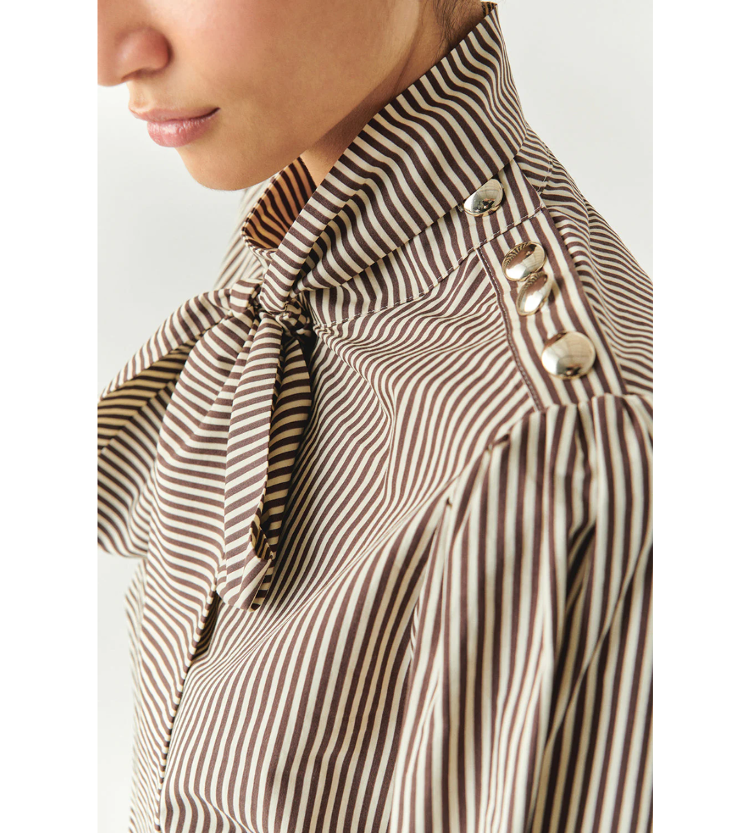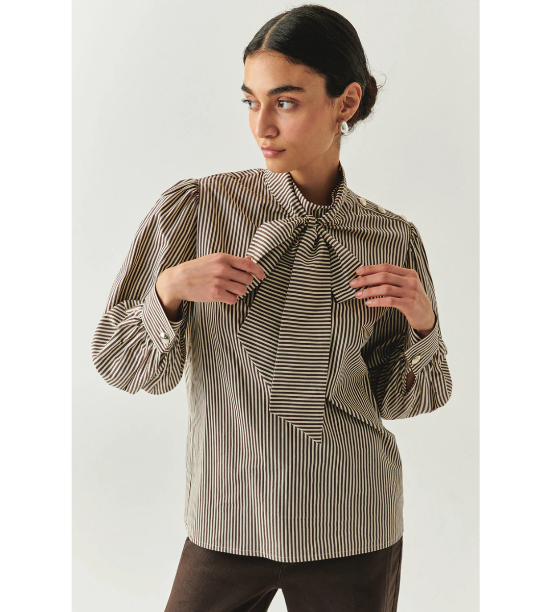 The Indigo Blouse features a high neckline, sculpted long sleeves, and a tie-front waist for added definition. Crafted from crisp cotton in brown and bone stripes.