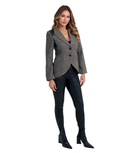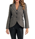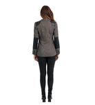 Ian cutaway blazer, notch lapel collar, single breasted w/ front button closure, front flap pockets, back vent slit, contrast faux leather patches, fitted.