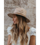 This striped fedora features a structured silhouette adorned with a slim leather band and bespoke gold hardware, offering a refined take on a summer essential.