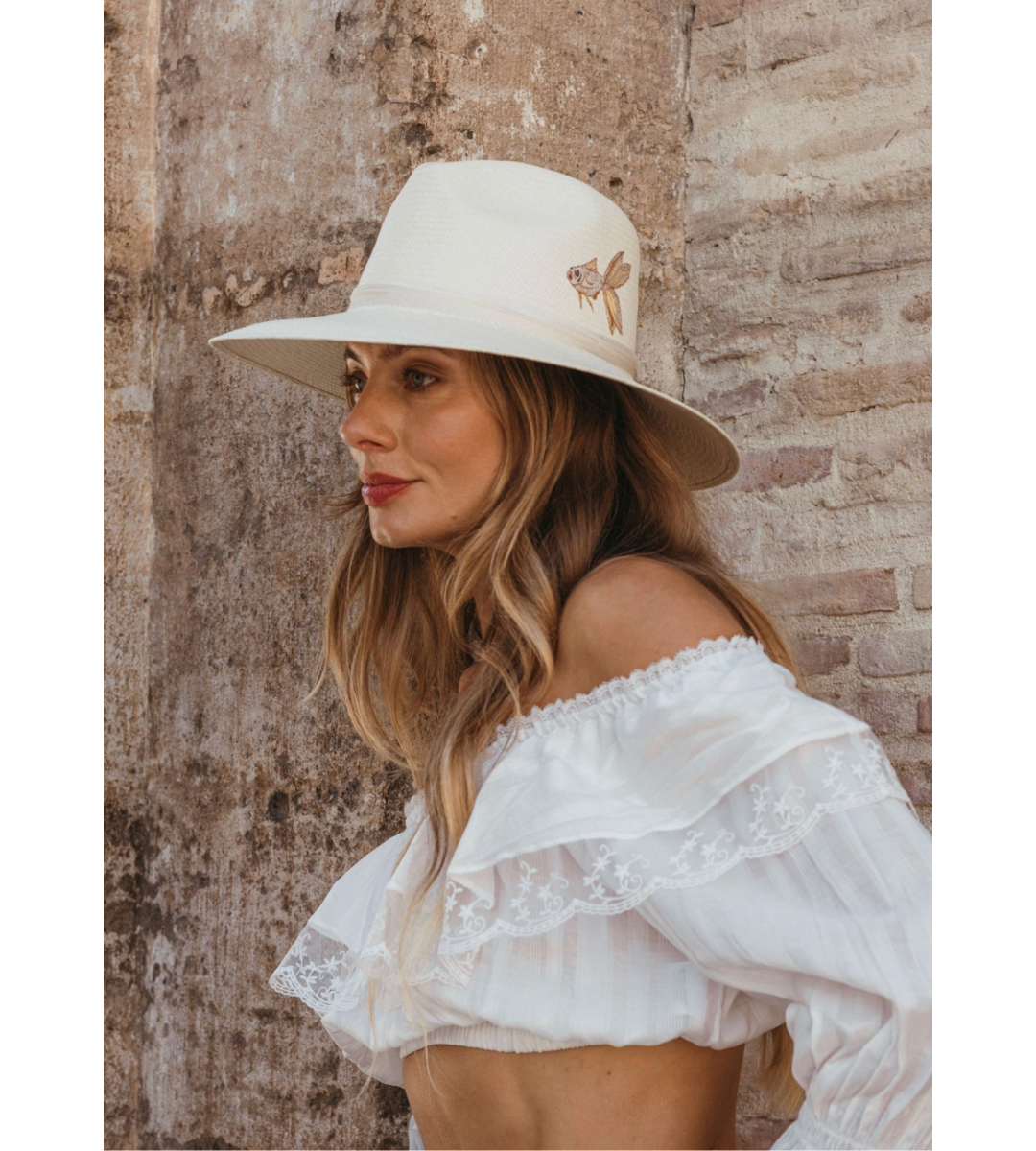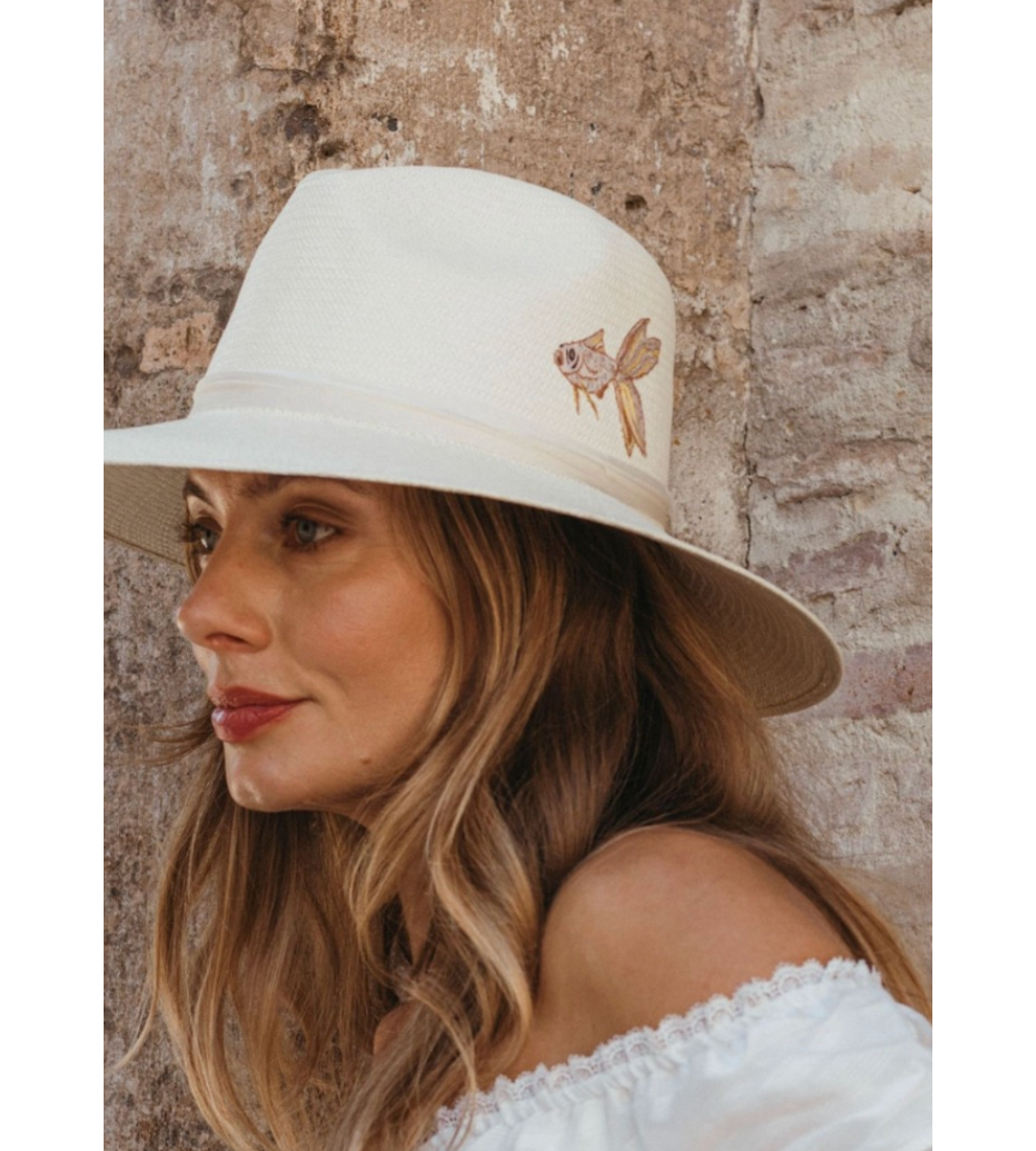 • A natural straw fedora with koi fish embroidery and ivory silk ribbon