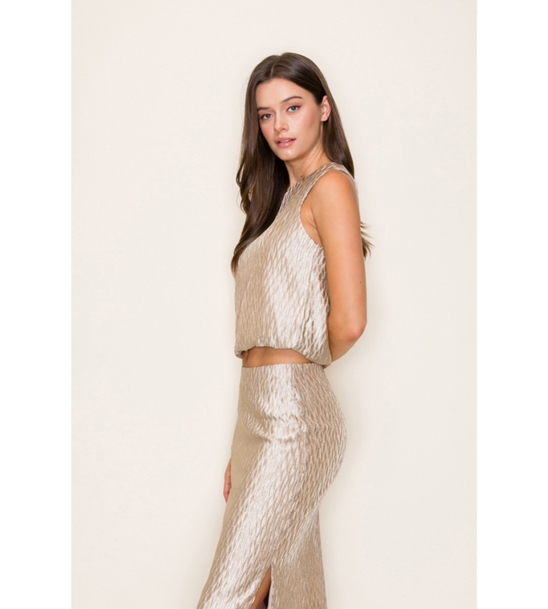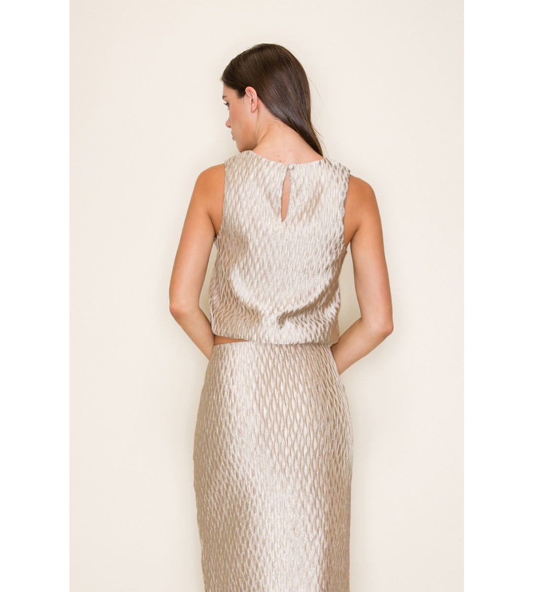 Shine effortlessly in the Katy Top, a textured gold piece designed to elevate your fall wardrobe. With its subtle shimmer and flattering, tailored silhouette, this top adds just the right amount of polish for seasonal events. Dress it up with the matching Katy Skirt for a cohesive look, or pair it with denim or trousers for a chic, stand-alone statement. Perfect for dinners, parties, and everything in between.