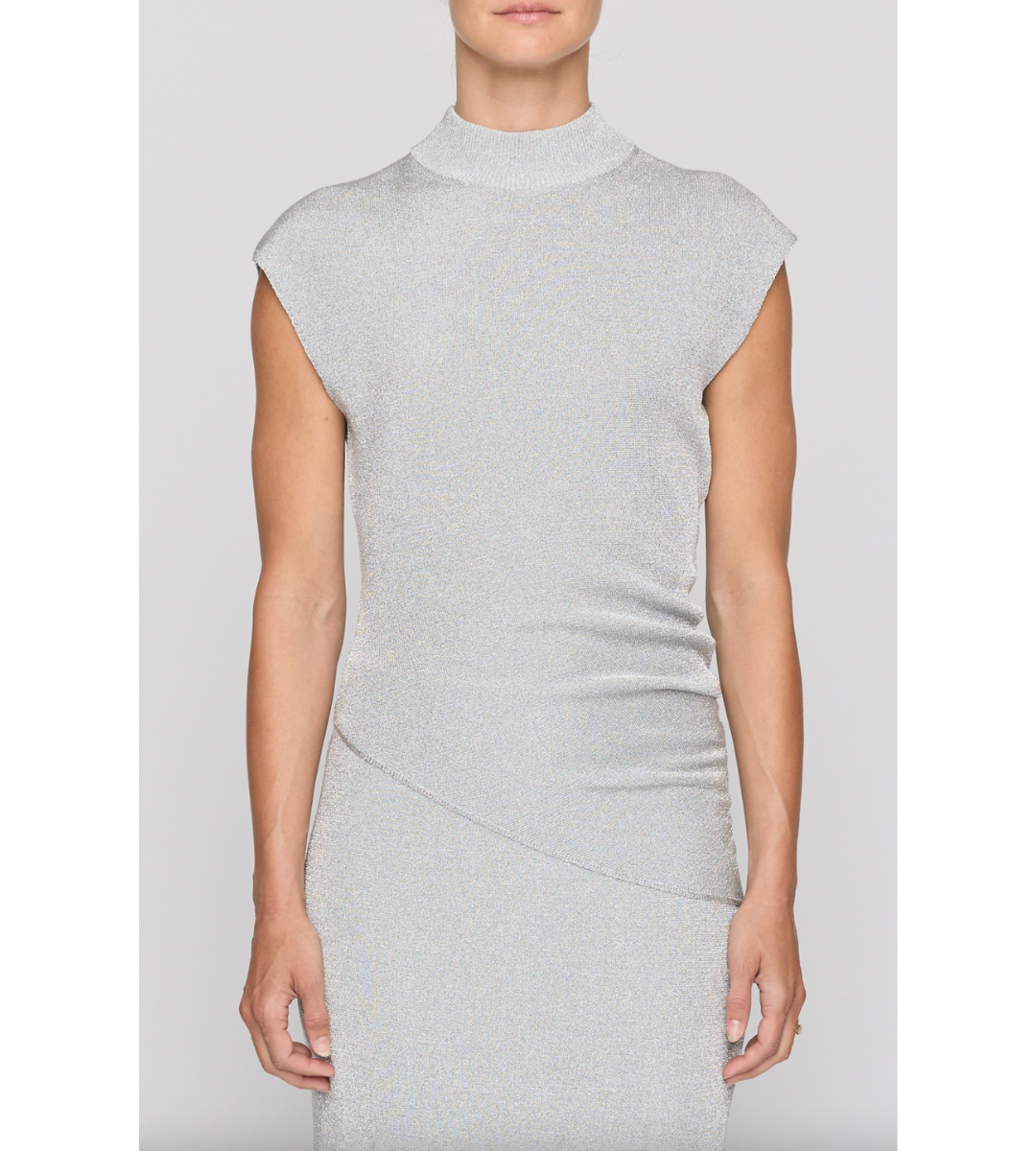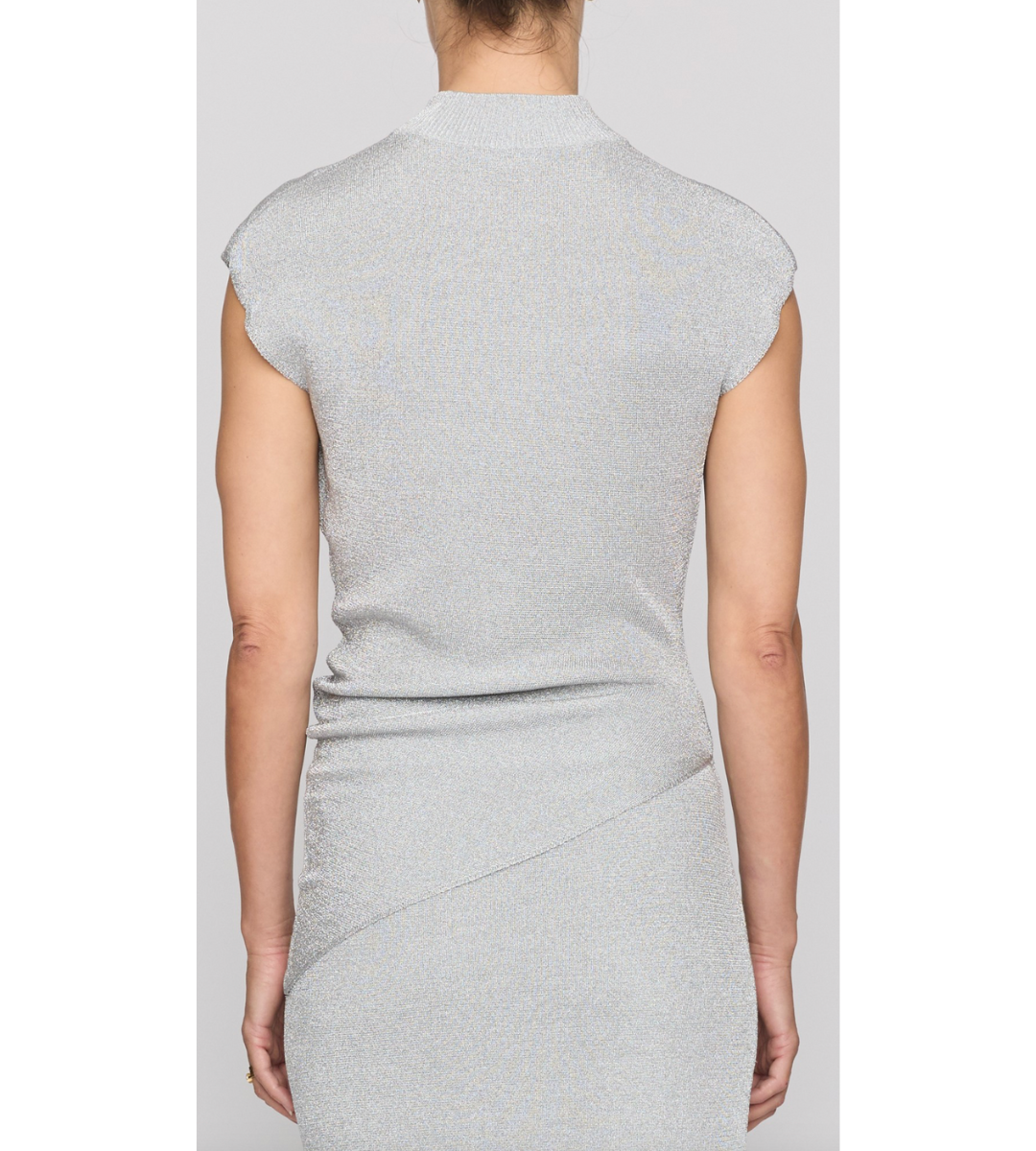 The Edith Top is woven in wrapped cotton melange fabric with subtle pearlescence in a soft mercury hue. This high-neck, cap-sleeve silhouette drapes effortlessly, featuring an asymmetrical hemline for a modern touch.