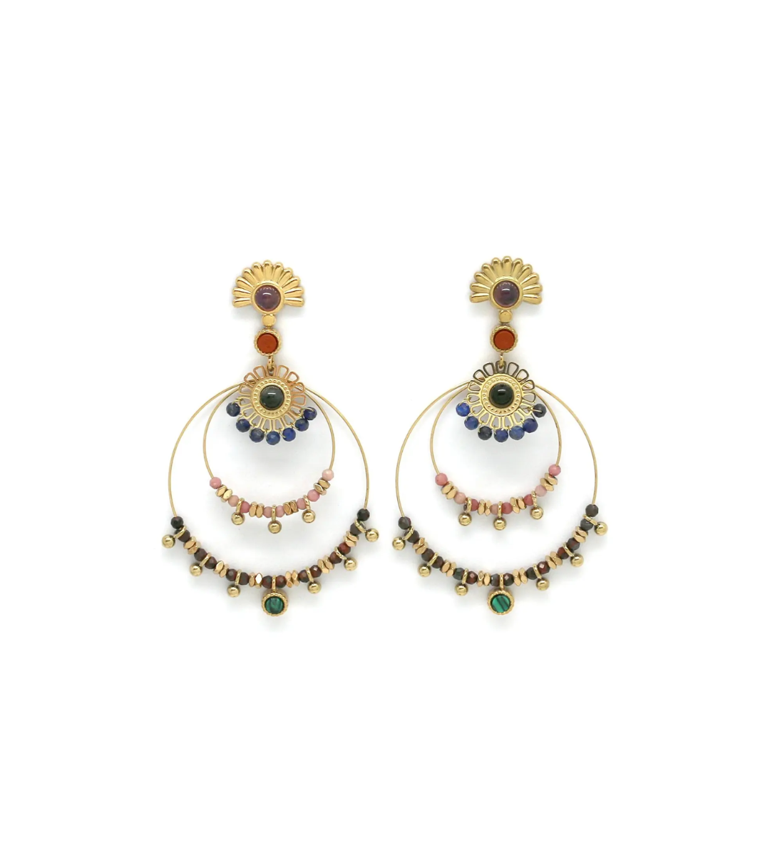 Graceful and eye-catching, these Semi-Precious Stone Delicate Double Hoop Fan Earrings combine elegance with artistic detail. Featuring two fine hoops that gently frame a fan-inspired design, each earring is accented with a semi-precious stone that adds a subtle pop of natural color.