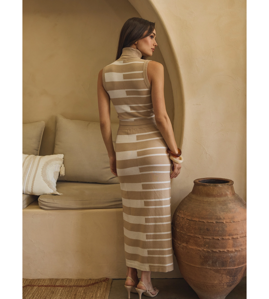 The Eden Set is your effortlessly chic go-to for refined comfort. Featuring a sleeveless sweater top and a coordinating taupe and cream midi skirt, this matching set brings a soft, elevated feel to everyday dressing. The neutral tones and flattering fit make it perfect for both casual outings and dressed-up moments — wear together for a polished look or mix and match with your wardrobe favorites. Cozy, versatile, and endlessly stylish.