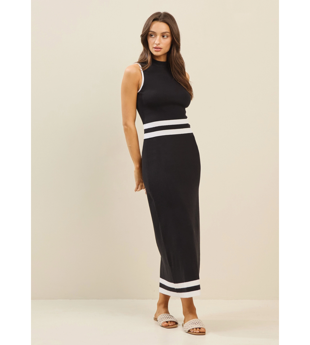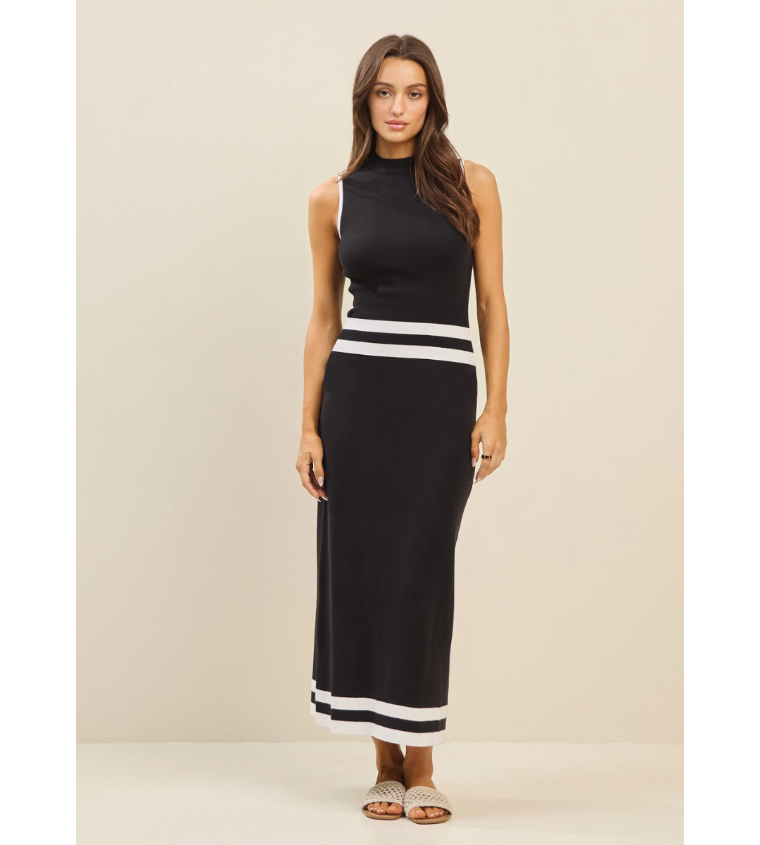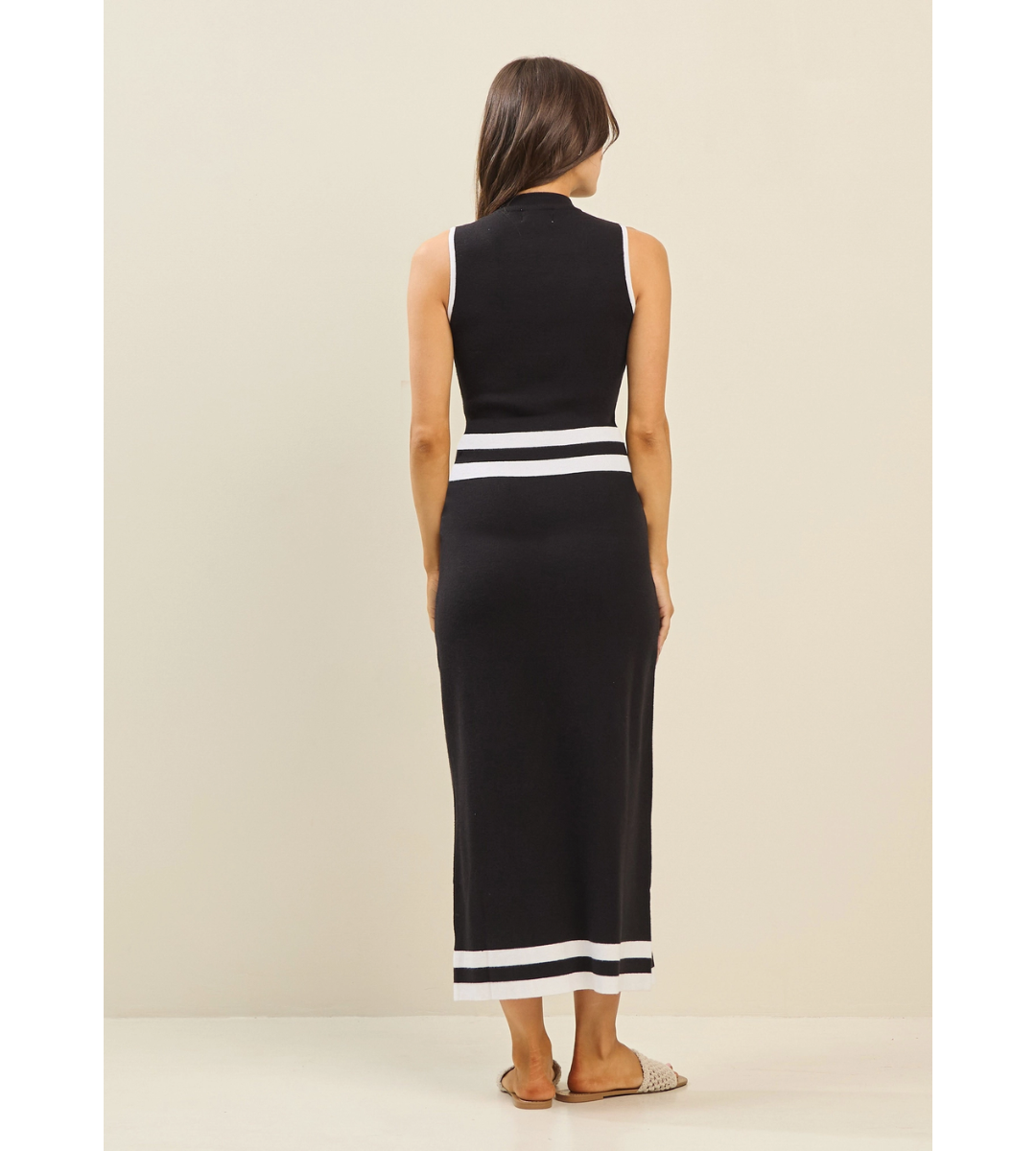 The Eloise Set delivers classic style with a modern twist. This black and white two-piece sweater set features a sleek sleeveless top paired with a matching midi skirt, both accented with subtle stripe detailing. Effortlessly polished and comfortable, it’s the perfect outfit for work, weekend brunch, or wherever the day takes you. Wear it as a set for a streamlined look or mix and match to make it your own.
