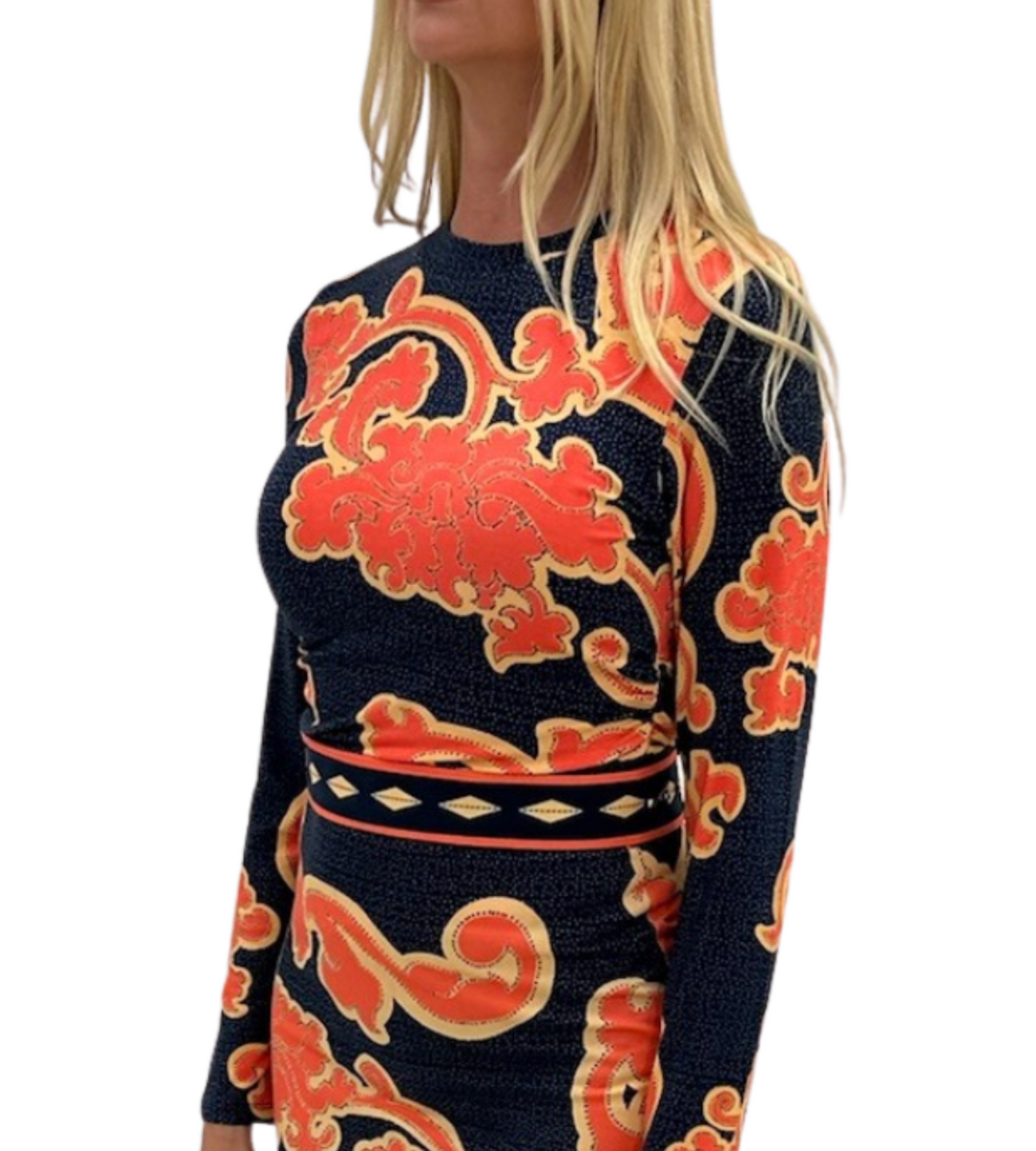 The Lynns Blouse is a chic navy and coral floral long-sleeve fitted top that combines elegance with comfort. Its tailored silhouette highlights your shape, while the vibrant floral print adds a fresh, feminine touch. Perfectly paired with the matching Portia Skirt, this set creates a cohesive and stylish outfit for both casual and dressy occasions.