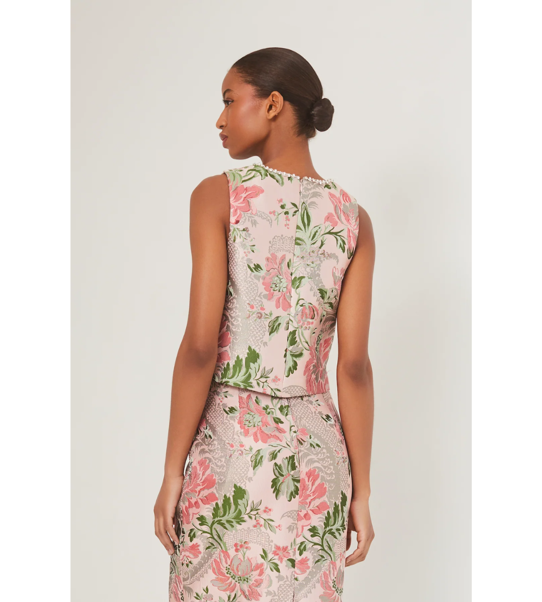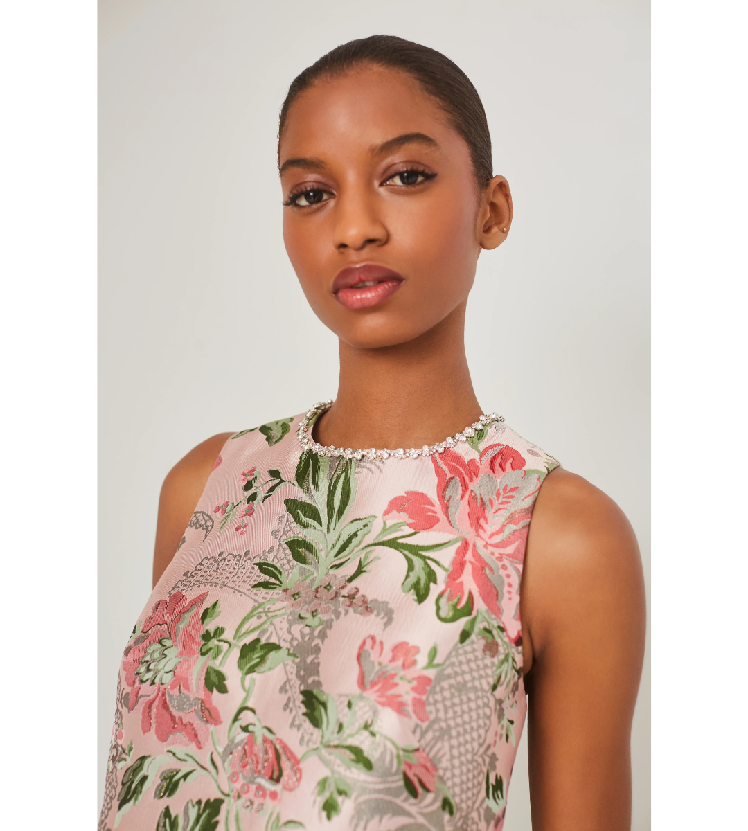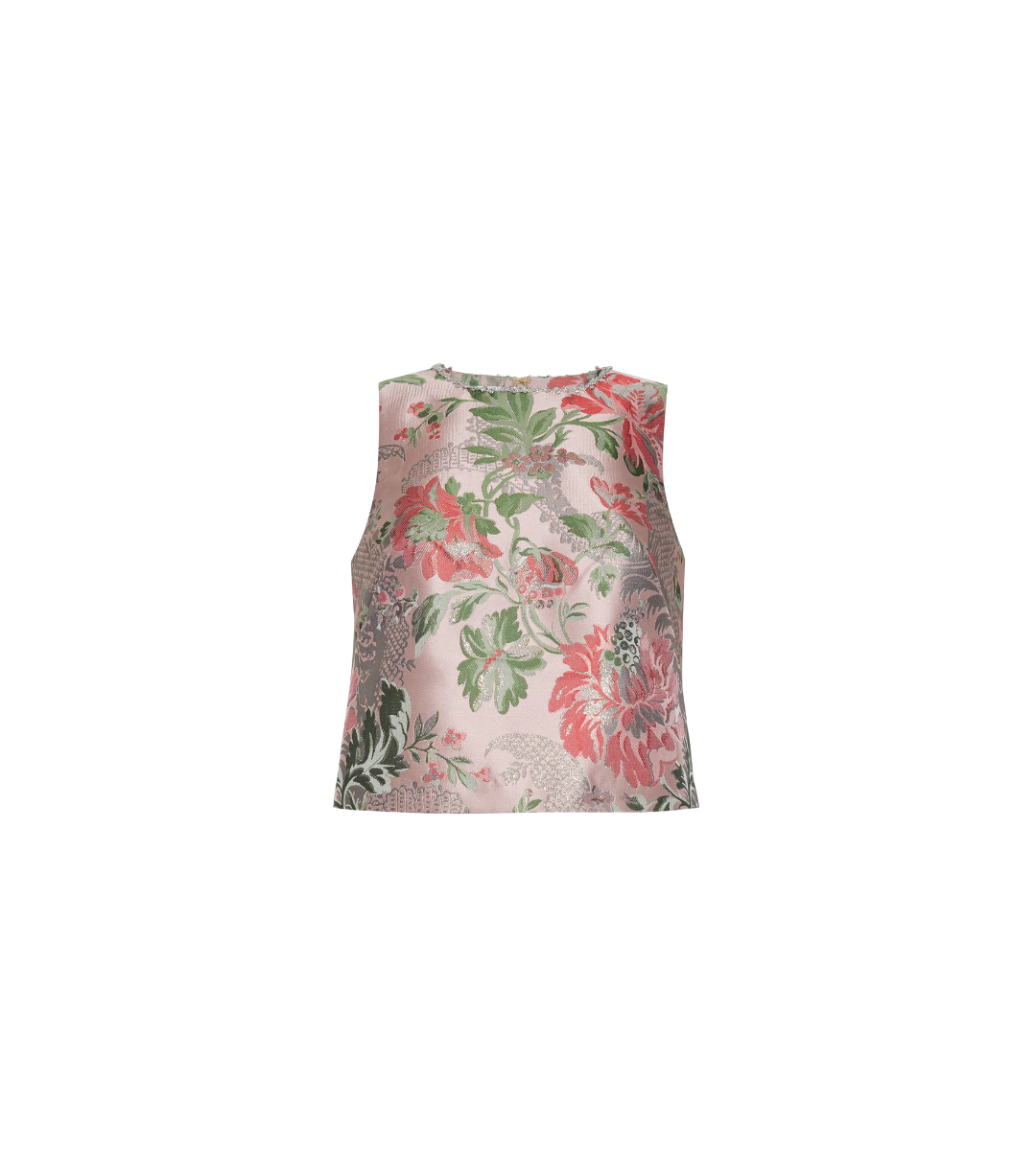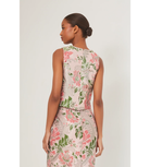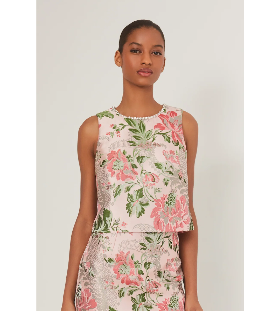 - Easy crewneck sleeveless shell top in vintage floral jacquard with embellished novelty rhinestone with silver metal trim around neckline