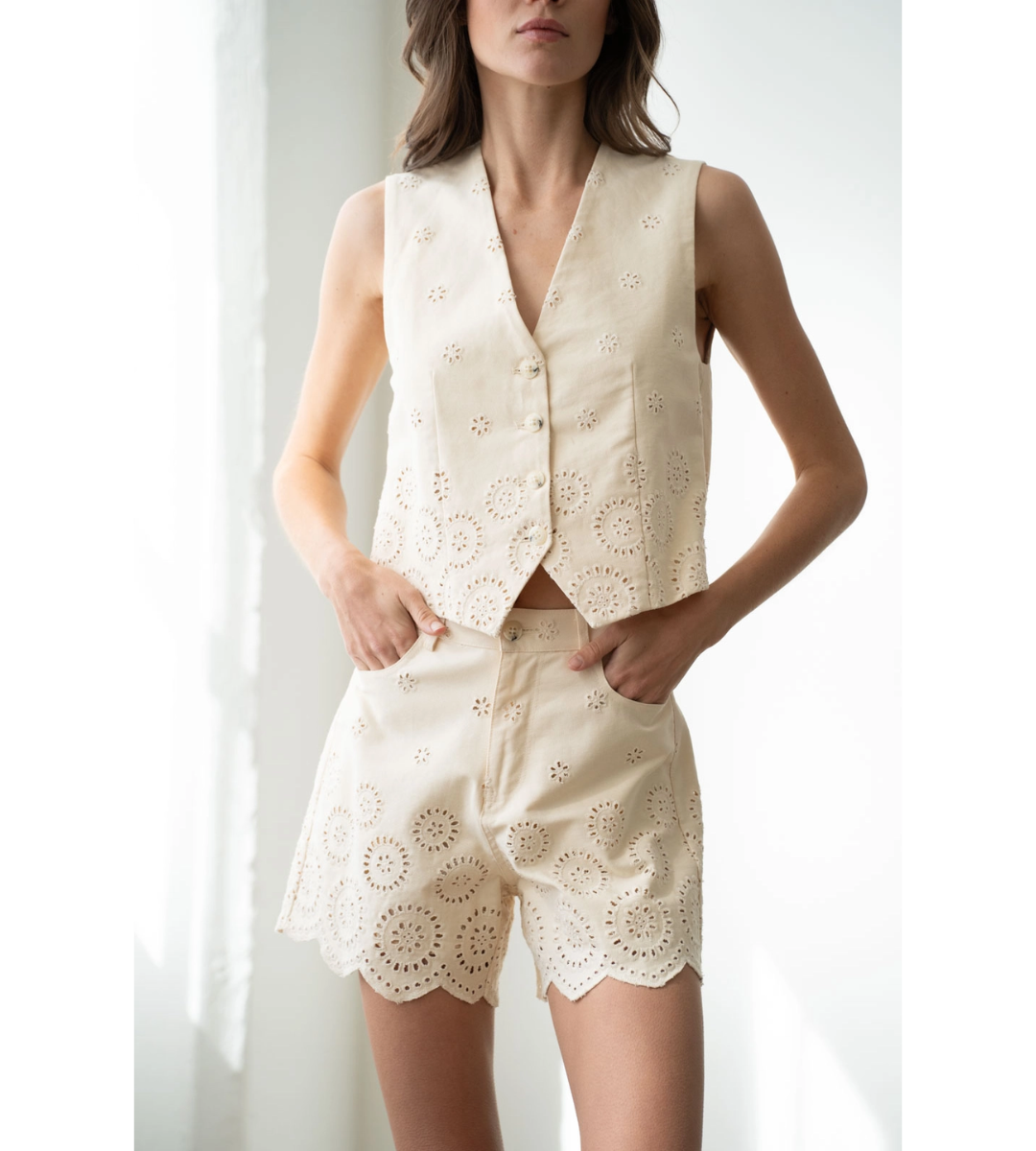 The Soraya Vest is where elegance meets edge. Crafted in a soft cream eyelet fabric, this sleeveless button-down vest features a tailored, fitted silhouette that flatters and defines. Thoughtful seaming and delicate detailing bring a modern romantic feel to this structured piece. Wear it solo for a chic summer statement or layered for year-round versatility.