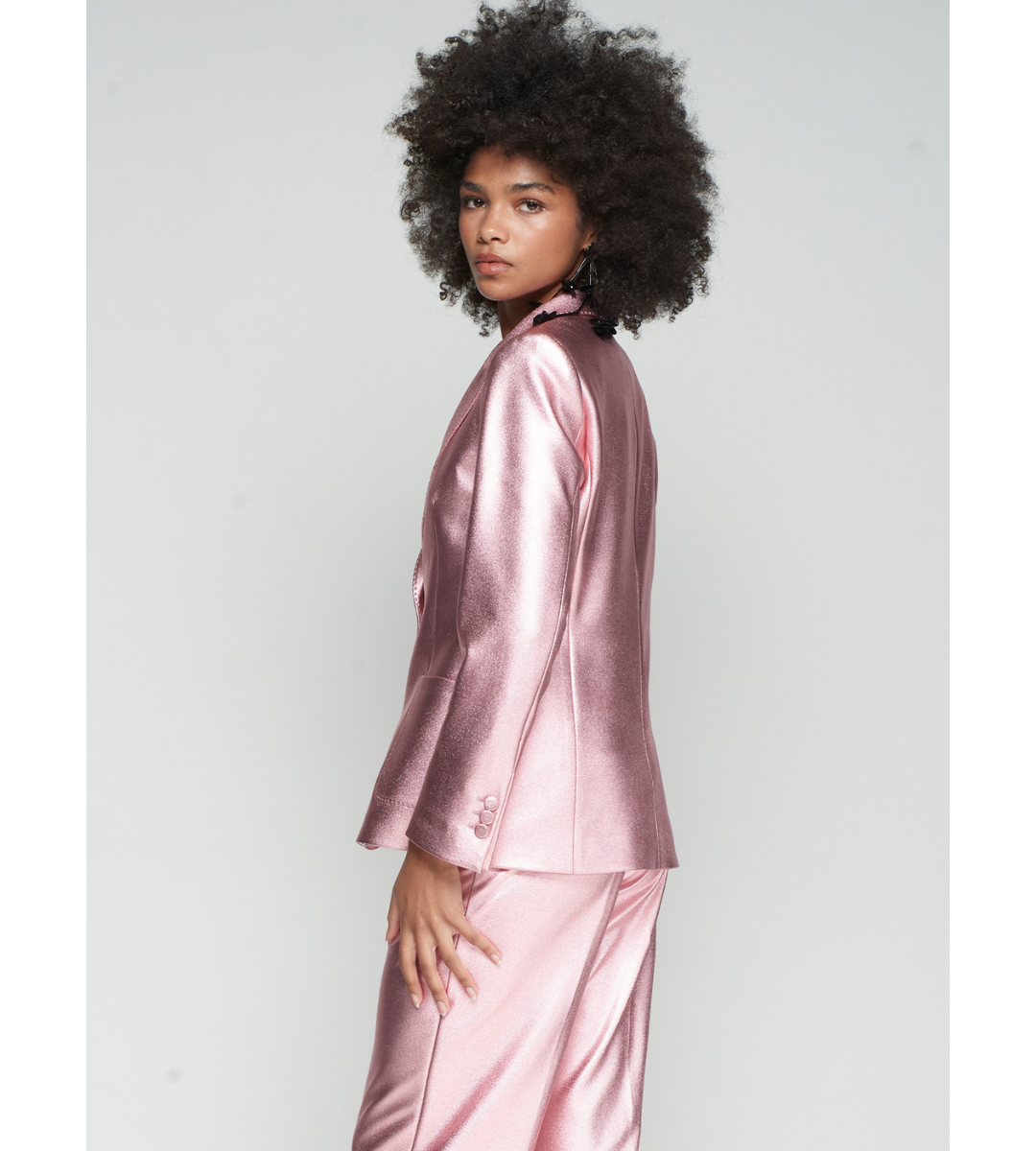 Jacket in pink metallic-effect fabric. Straight fit with classic lapel, matching fabric button and patch pockets.