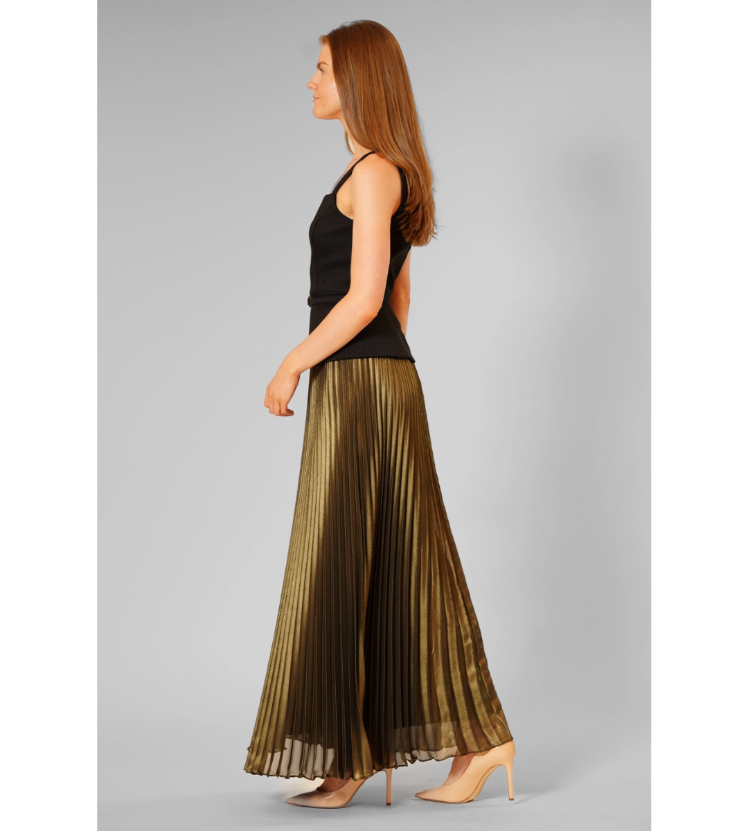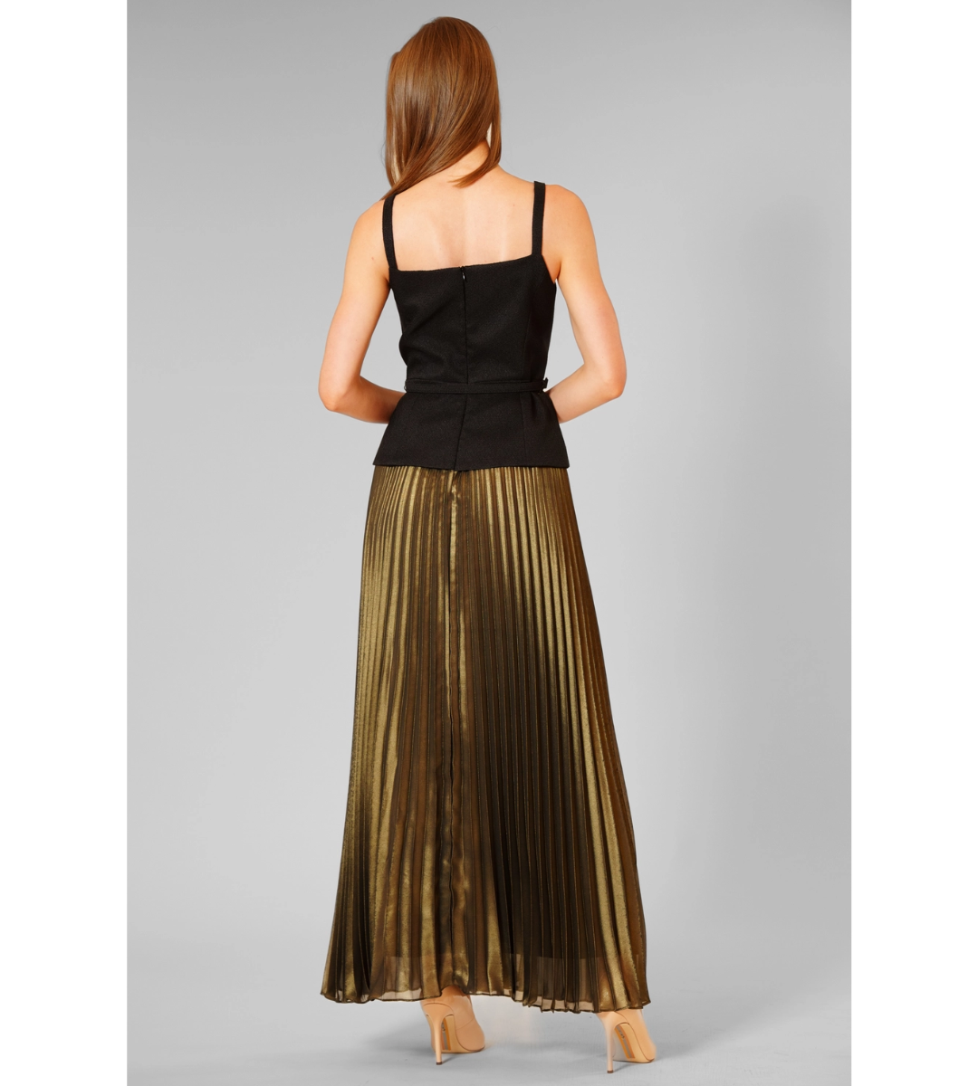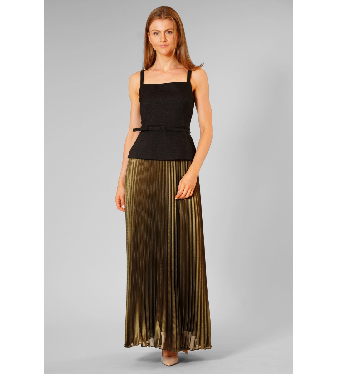 Elevate your next event in this gorgeous pleated gown. Featuring a sleek black scuba top and a radiant gold pleated chiffon skirt, this waist-defining silhouette perfectly blends modern structure with festive shimmer.