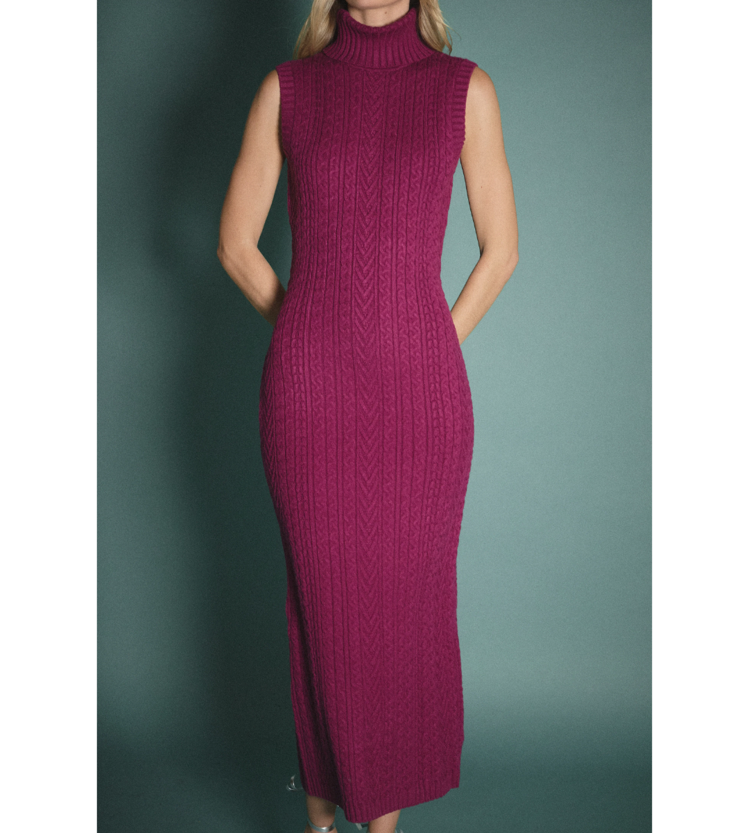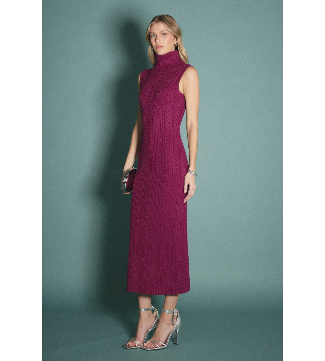 Crafted in soft, textured cable knit fabric, this sleeveless silhouette features a chic mock neckline and a flattering midi length, striking the perfect balance between comfort and elegance