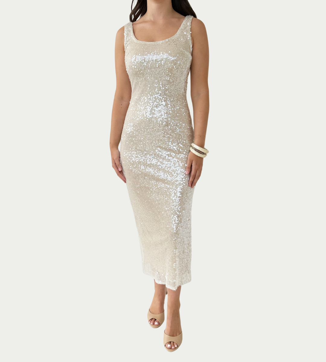 The Hattie Dress is a glamorous sequin champagne midi dress, designed to make a statement at any special occasion. This dress features shimmering sequins, offering a dazzling effect as light reflects off its surface. The "champagne" hue gives it an elegant, soft, and neutral tone, making it versatile enough for both daytime and evening events. With a midi-length cut, the dress strikes a balance between formal and playful, hitting around the mid-calf for a flattering silhouette.