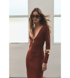 Unleash sophisticated allure in the Maurice Dress, a striking brick knit maxi designed for effortless elegance. This long-sleeve silhouette features a captivating plunging V-neckline, dramatically enhanced by a chic, central gold-tone ring detail that adds a touch of modern hardware.