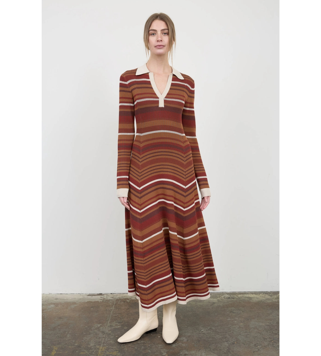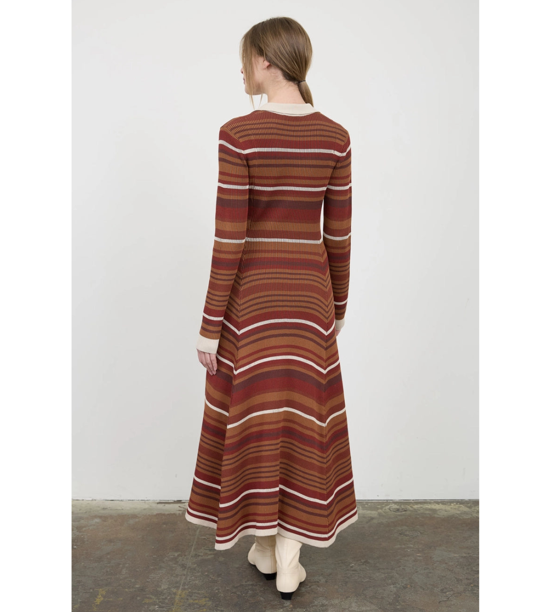 This midi dress features a V-neckline with a collar, showcasing a multicolor striped pattern in a sweater knit fabric. Designed with an A-line silhouette, it offers a comfortable fit and is unlined.