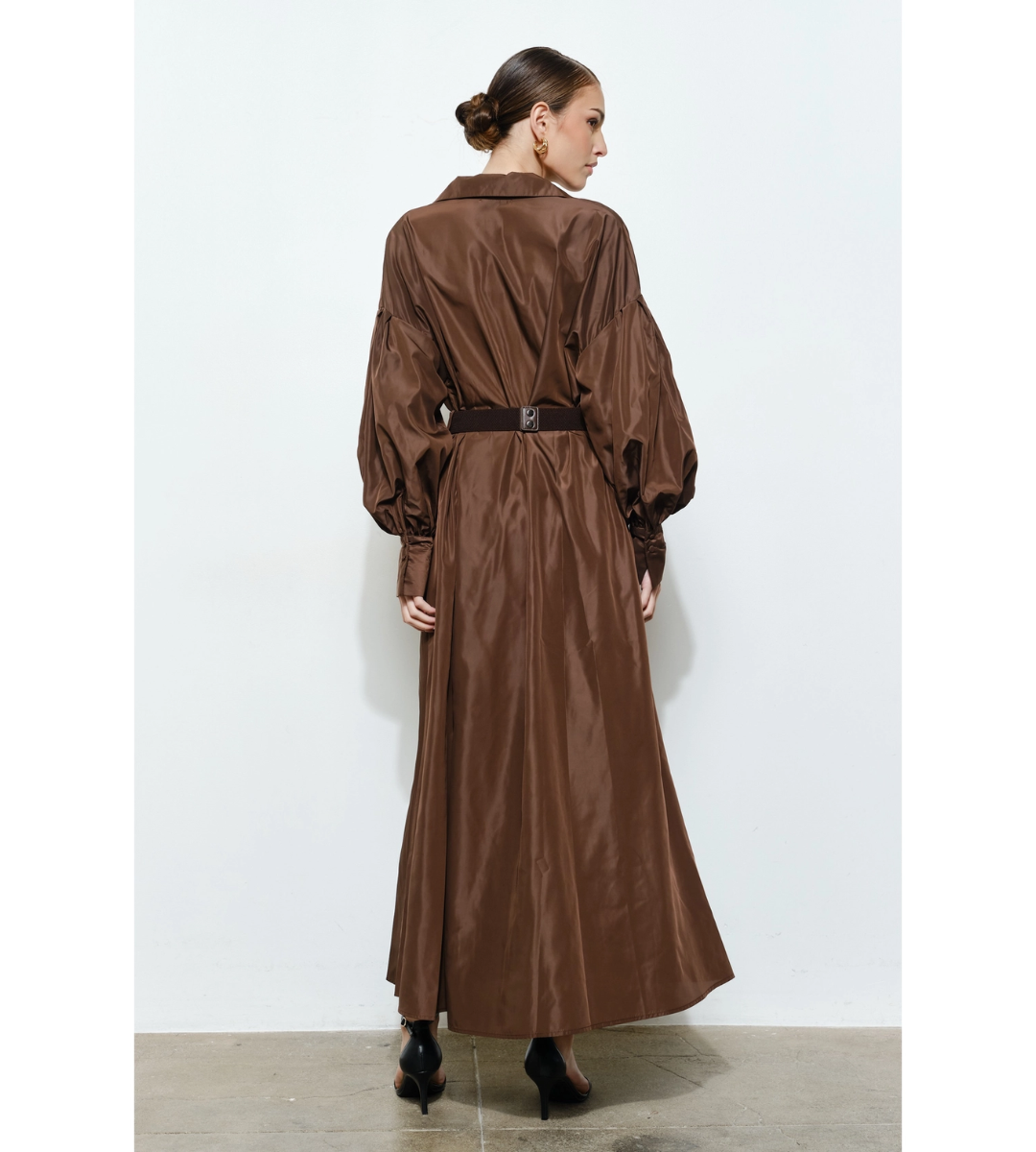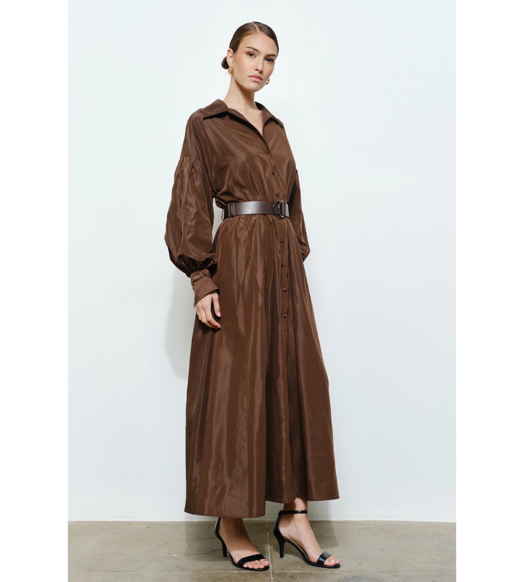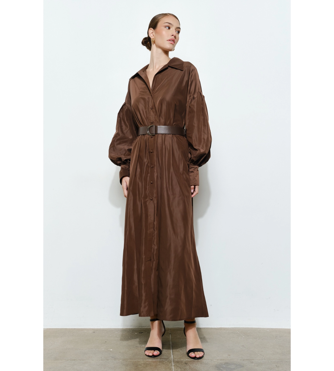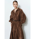 A chic, shining nylon maxi dress with a soft collared neckline and a classic button-down front. The relaxed, peasant-inspired sleeves balance beautifully with the elastic waist and matching belt, giving you an easy, flattering shape.