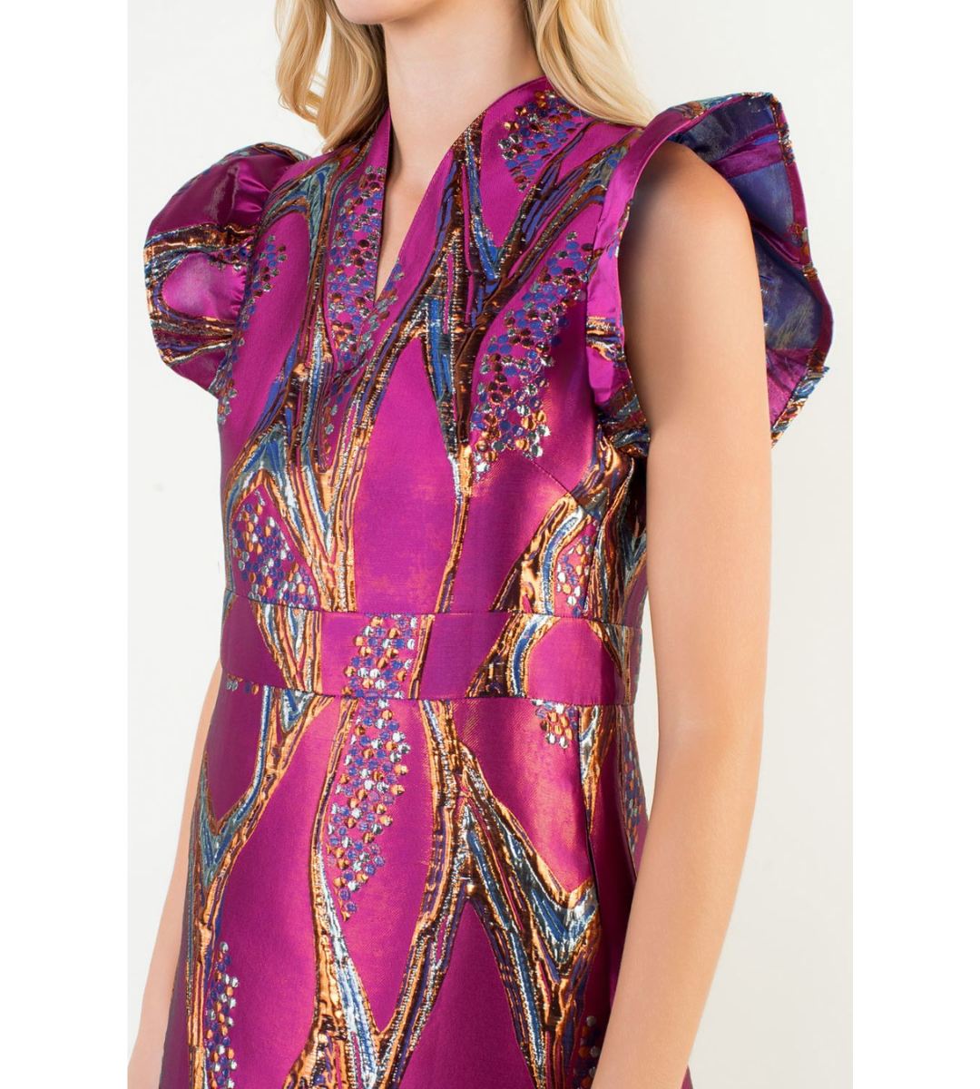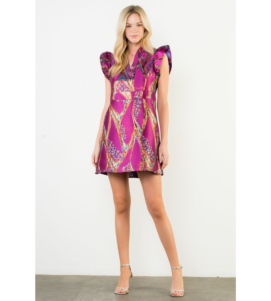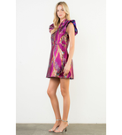 The Everglen Dress dazzles in purple multi-metallic hues with playful ruffle shoulder caps—perfect for turning heads at any special occasion or festive event.