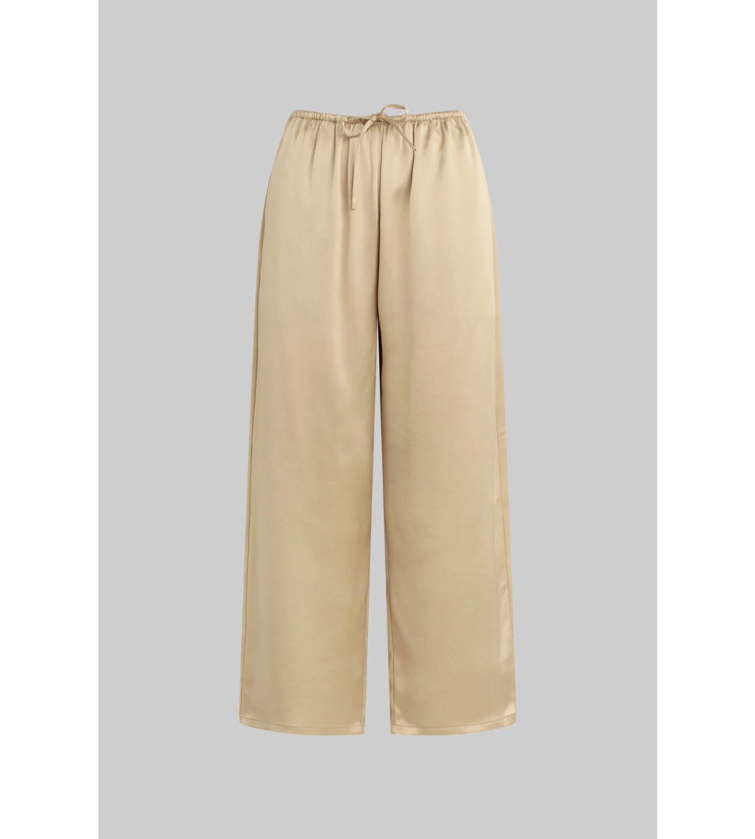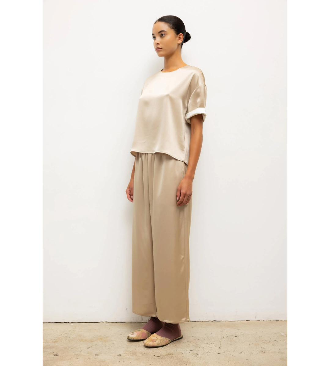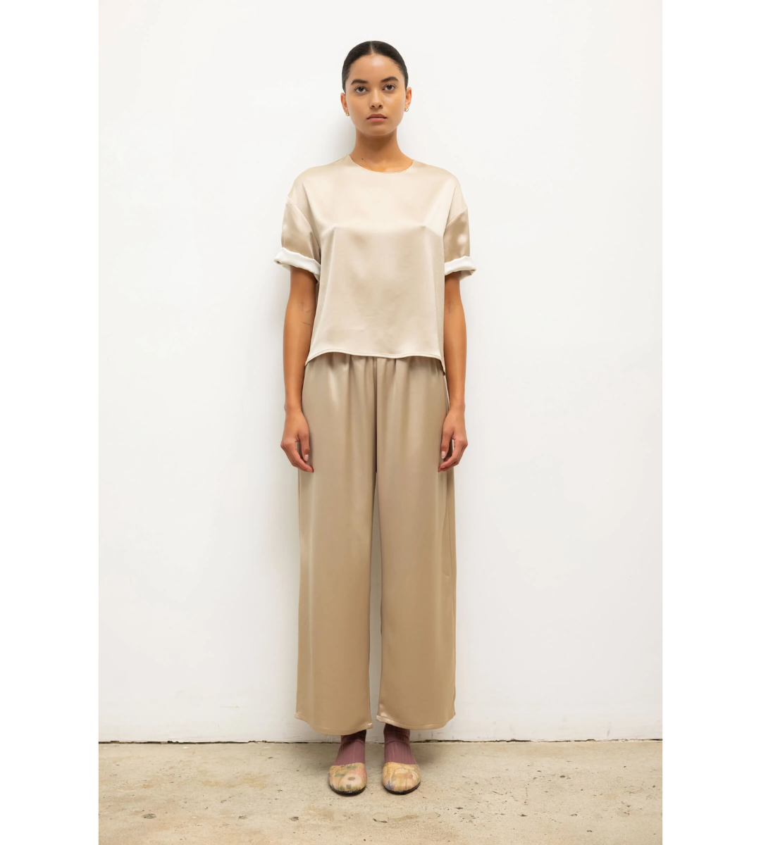 Cut in Japanese-crafted Barb Satin, the Barb Crop Drawstring Pant features an adjustable drawstring waistband, side and back pockets, and a relaxed, cropped length. By LESET.