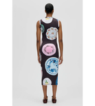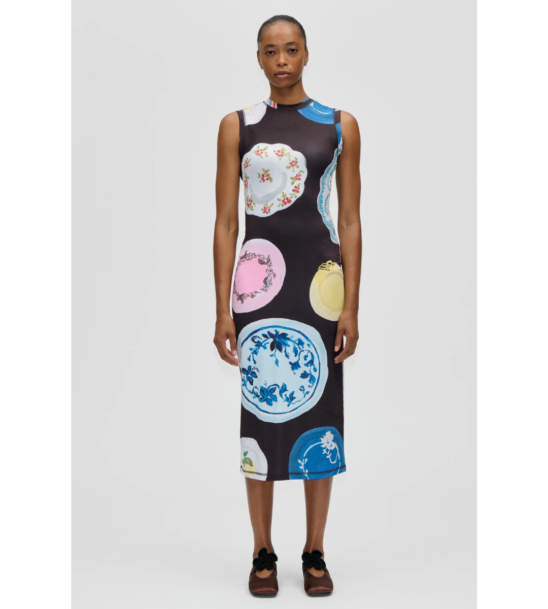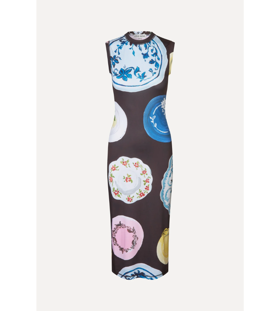 Dark brown sleeveless midi dress adorned with a hand-painted plate artwork. Designed in a sleek bodycon silhouette, crafted from a soft and stretchy material for a comfortable and flattering fit.