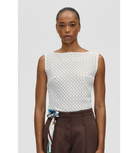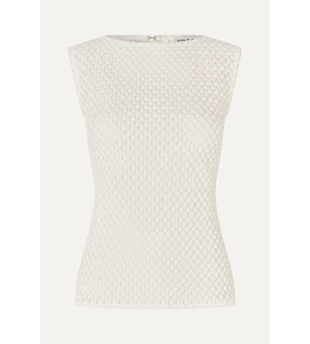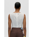 Sleeveless fitted top in white crochet lace. Designed with a structured texture and round neckline. Features a zip closure at the back and a slightly sheer finish.