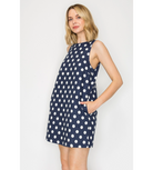 Playful yet timeless, this Navy & White Polka Dot Sleeveless Shift Dress is a versatile wardrobe staple you can wear year-round. Designed in a flattering mini length, it features a classic shift silhouette with thoughtful details like contrast piping at the neck and armholes, a discreet back zipper, and convenient side pockets.