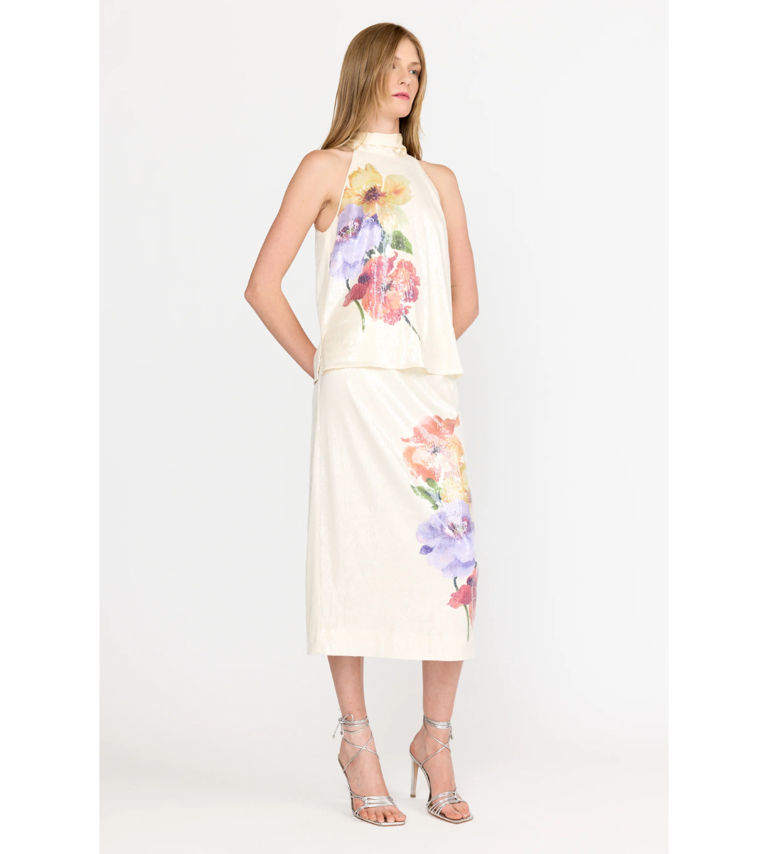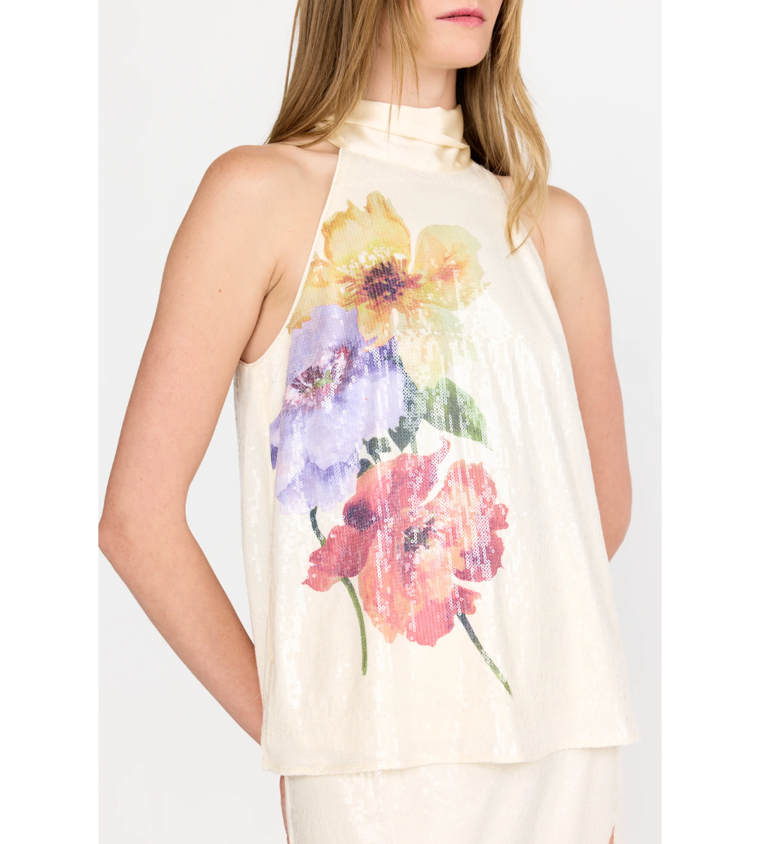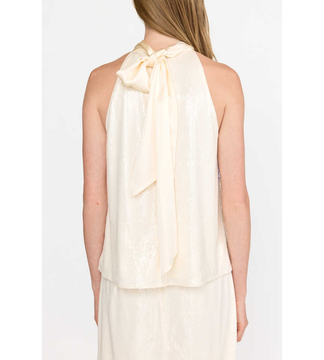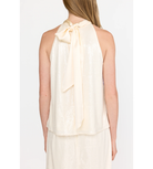 A discreet button closure is subtly concealed beneath the tie, creating a graceful finish from every angle.