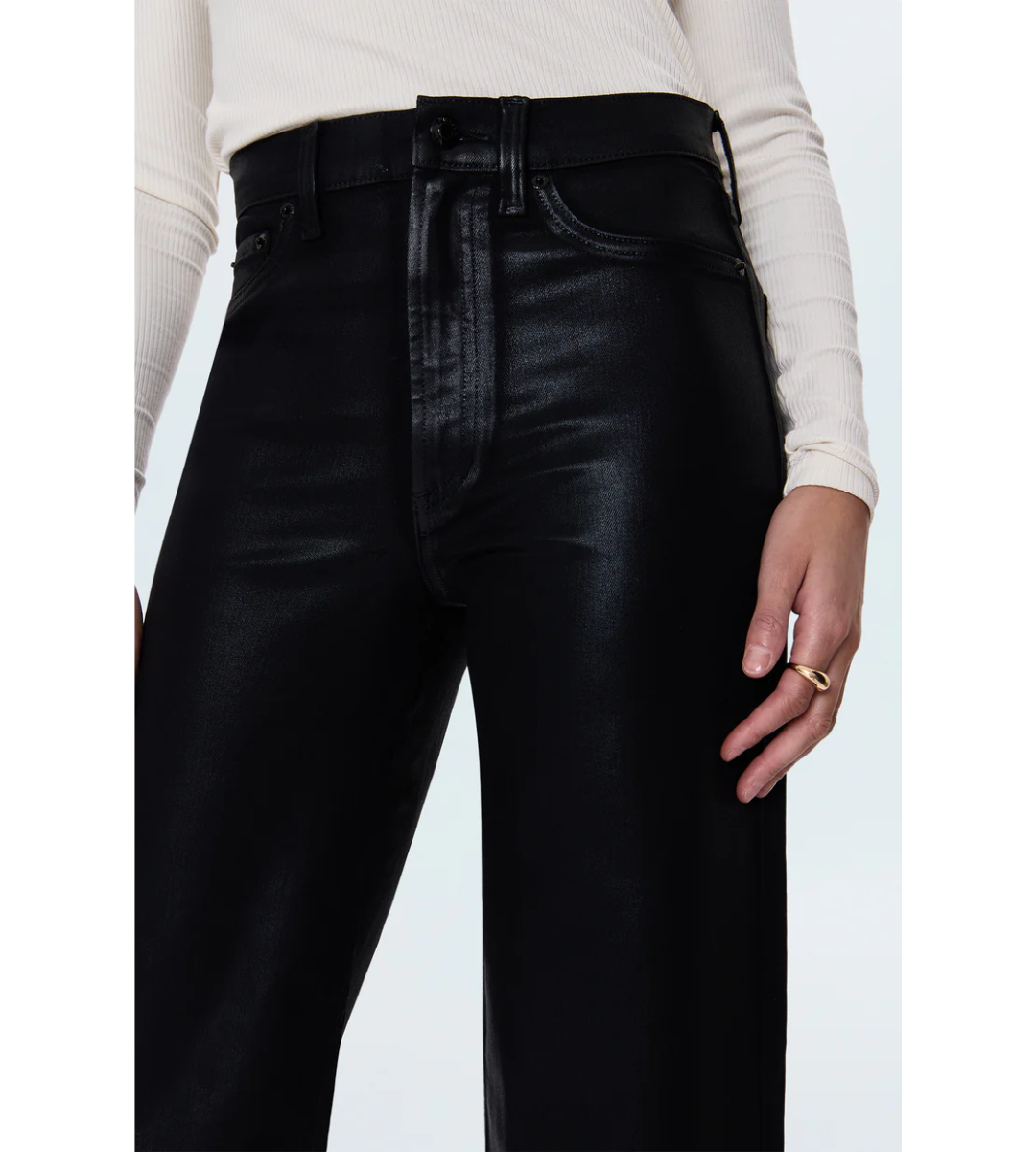 Lana sits at a high rise with an ultra wide leg silhouette and full-length 33" inseam that feels effortlessly dramatic. The ultra wide opening creates maximum impact while the relaxed fit flows beautifully. Crafted from signature comfort stretch denim in Coated Noir, a rich black finish with luxurious coated texture.