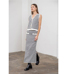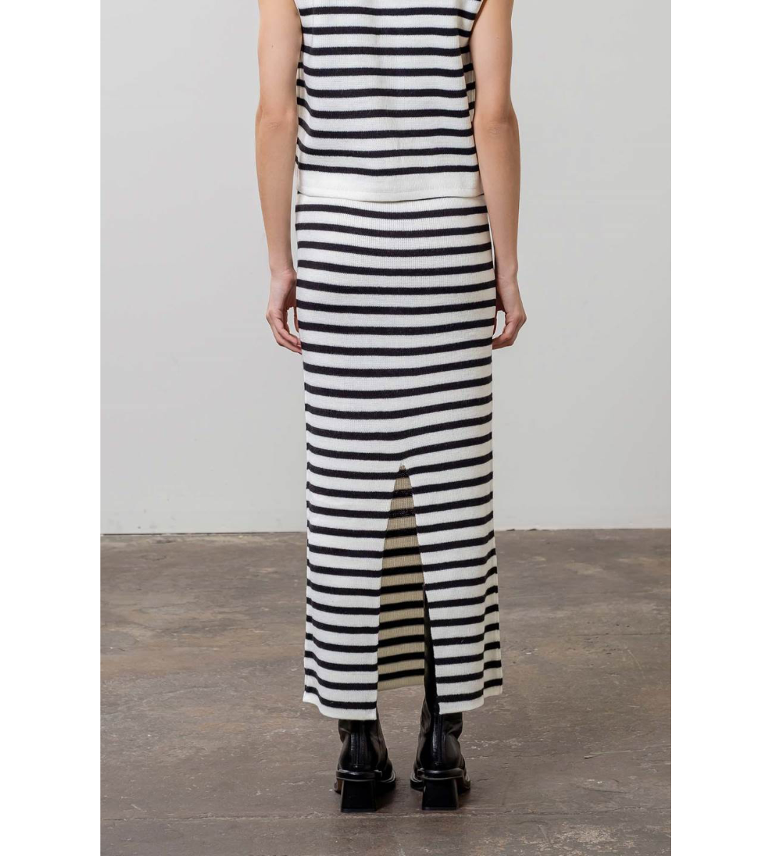 The Nancy Skirt is a black and white striped knit midi that blends comfort with classic style. Its flattering fit and cozy texture make it a perfect piece for fall, easily dressed up or down for effortless everyday chic.